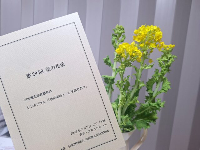 2月7日(土)毎年、大阪と東京の交互で開催される司馬遼太郎の命日「菜の花忌」に行きました。一昨年に続き2回目の参加です。 プログラムの第1部は第29回 司馬遼太郎賞の贈賞式。熊本史雄氏(駒澤大学教授)「外務官僚たちの大東亜共栄圏」(新潮社 刊)本人の受賞のあいさつは易しくそして楽しく聞けました。 第2部「豊臣家の人々」を語りあう パネリスト安倍龍太郎氏(作家)・門井慶喜氏(作家)・木下昌輝氏(作家)・諸田玲子氏(作家)・司会 上田早苗氏(NHKアナウンサー)