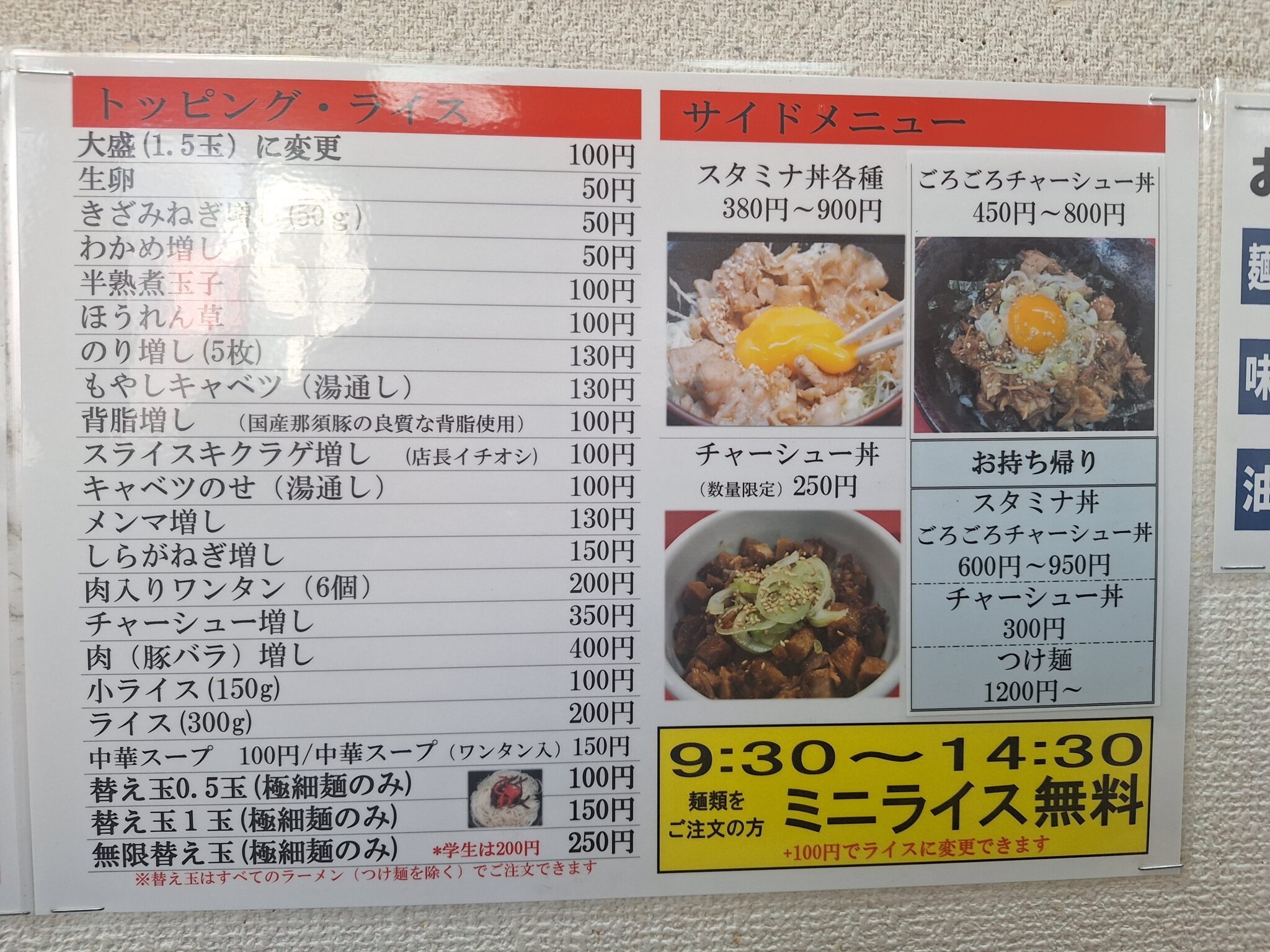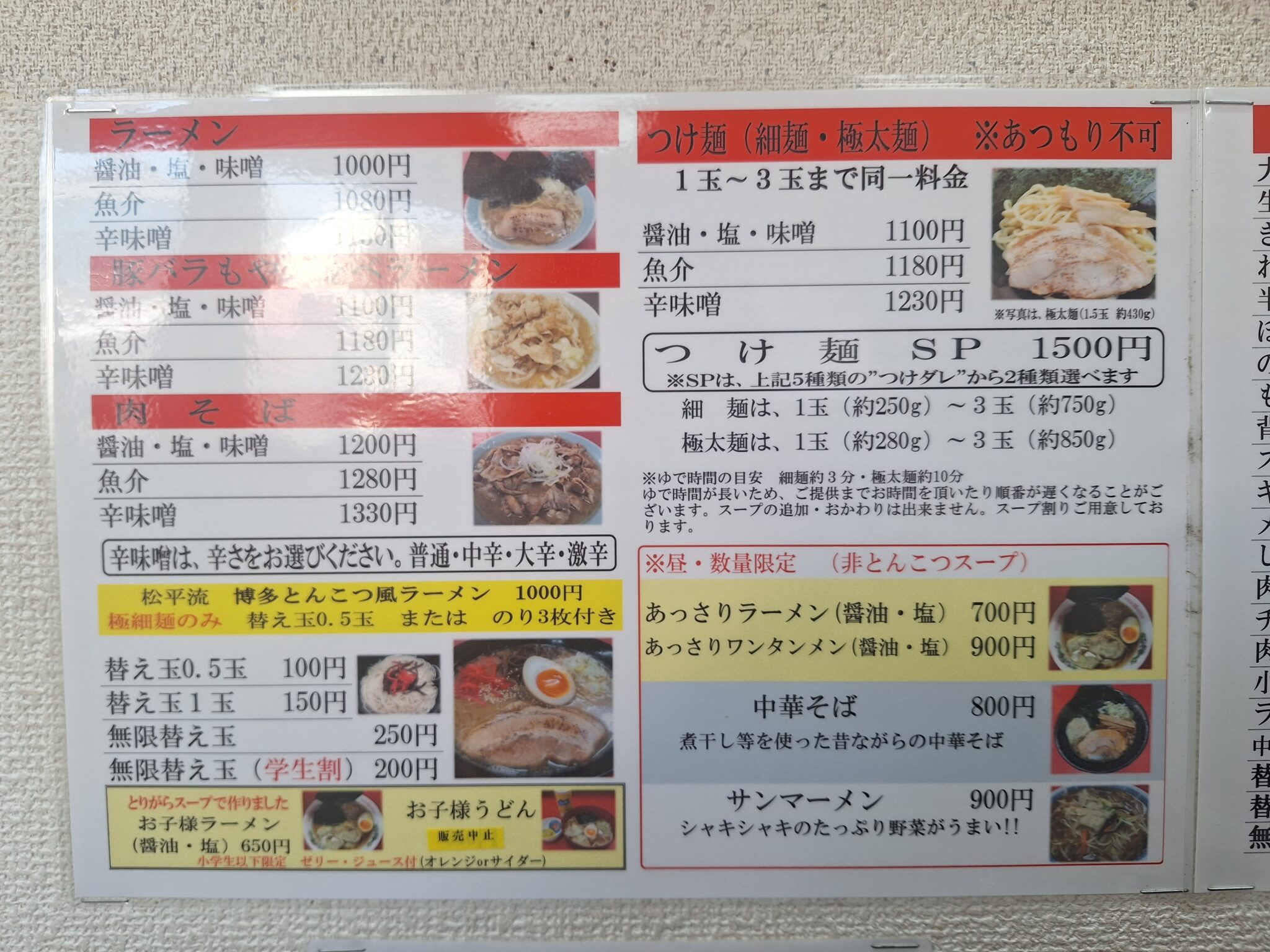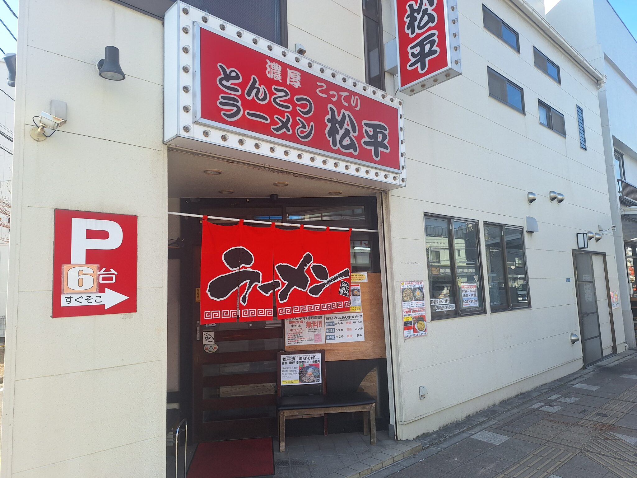 昼時に国道16号線沿い六浦のとんこつラーメン松平(まつひら)へ。午前中ランチサービスで麺類注文するとミニライス無料、学生証を見せると麺の大盛が無料?のようです。関東学院が近いから学生のお客さんが多く(男ばっかり)皆さん麵大盛、ミニライスを注文。さすが若者!