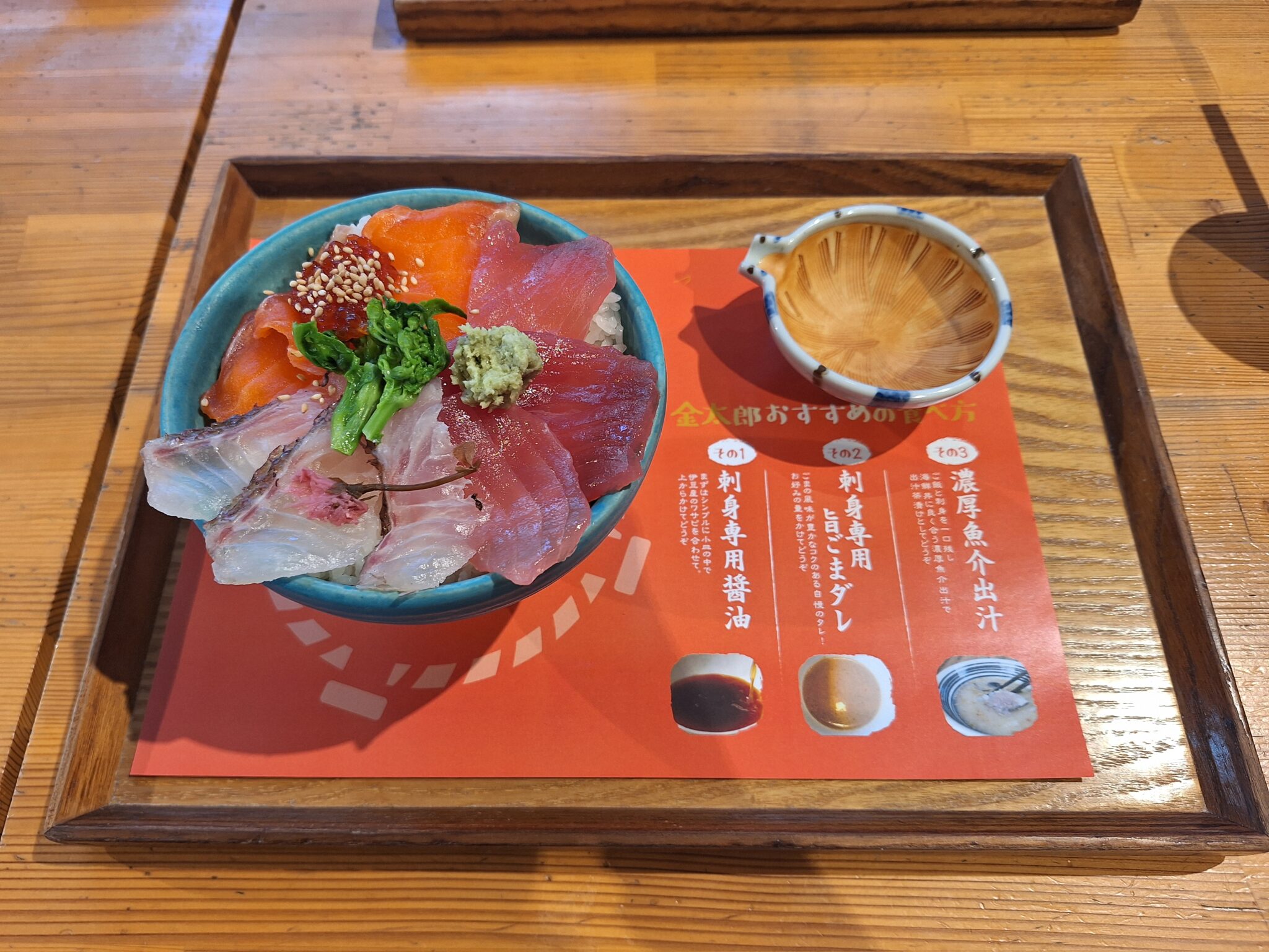 妻は、春めく海鮮3種丼。おすすめの食べ方、その1 刺身専用醤油・その2 刺身専用旨ごまダレ・その3 濃厚魚介出汁で満足のようでした。