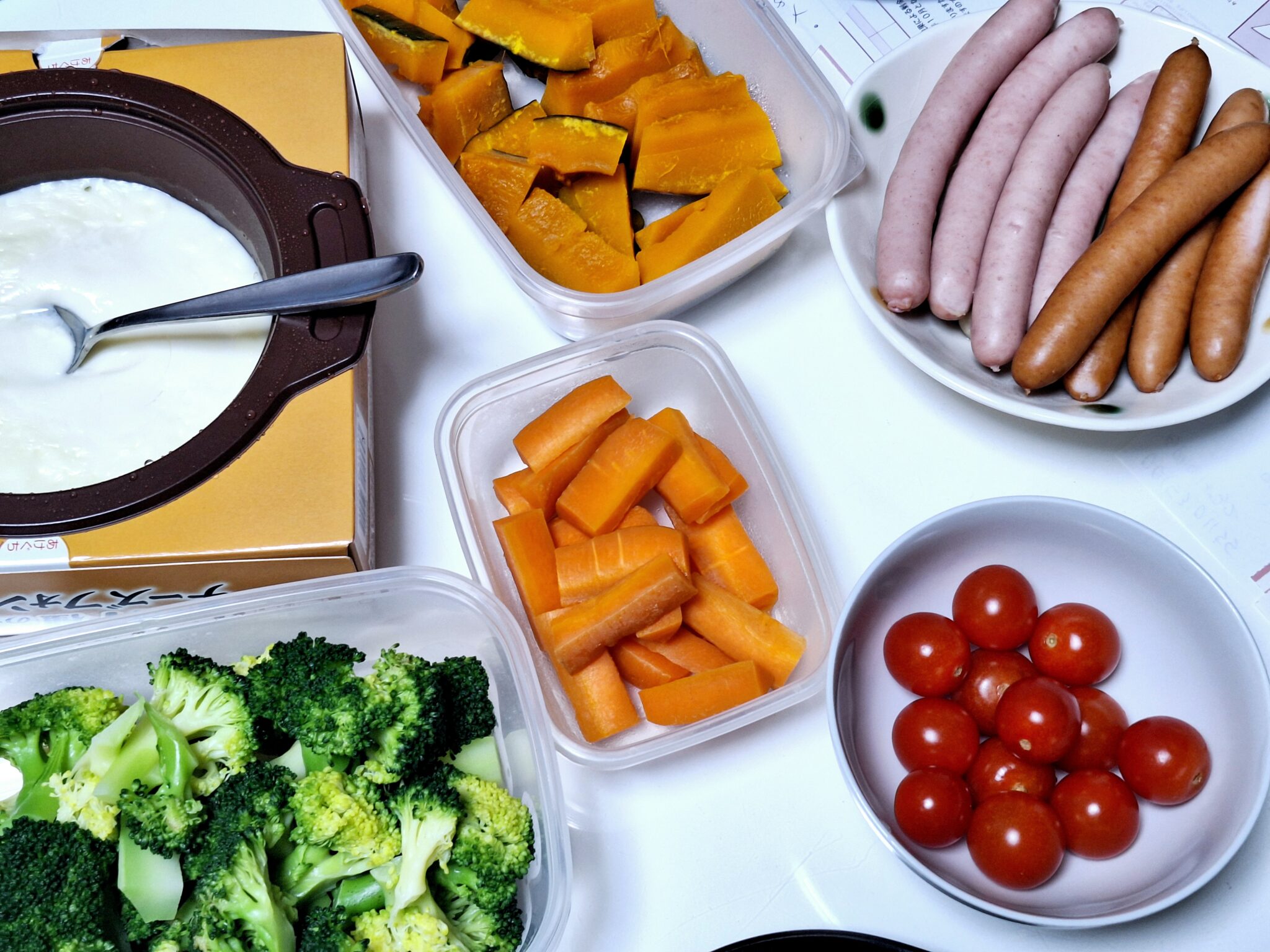 夜ごはんにチーズフォンデュ。ホワイトウインナー・あらびきウインナーと緑黄色野菜をボイルして。旨かった、ごちそうさま!