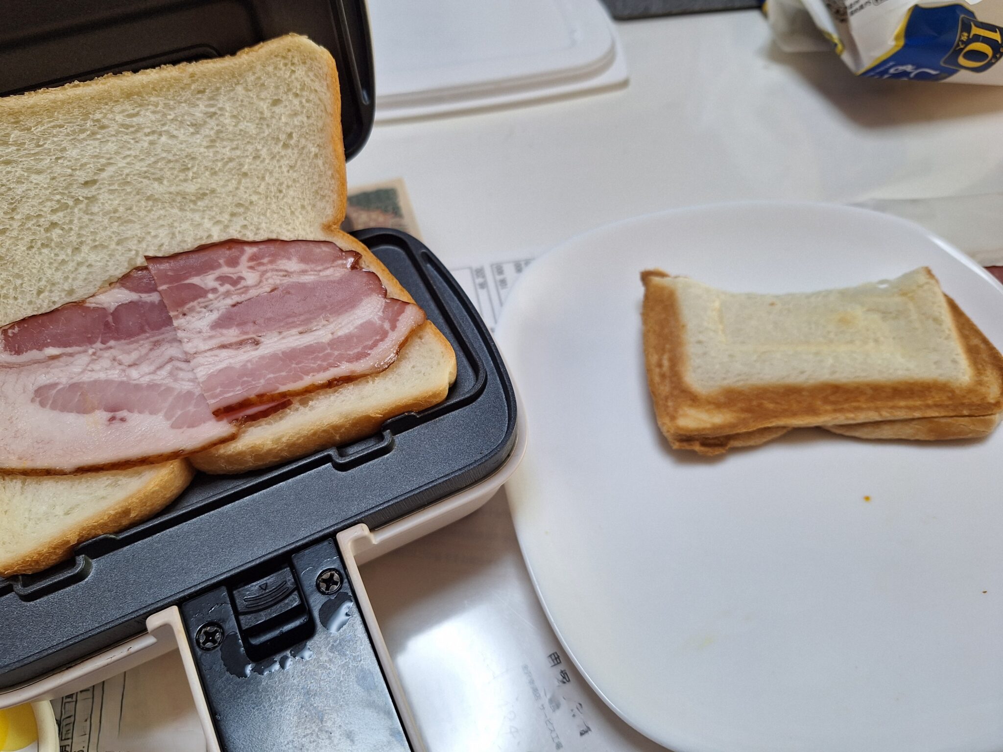 ある日の朝食にホットサンド。ベーコンとスライスチーズを入れてホットサンドメーカーで。ごちそうさま!