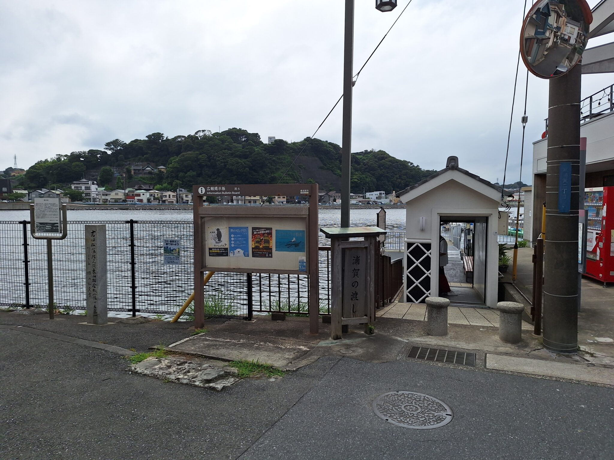 浦賀の渡し。左の石柱は吉田松陰・佐久間象山の会談場所(徳田屋跡)の碑。