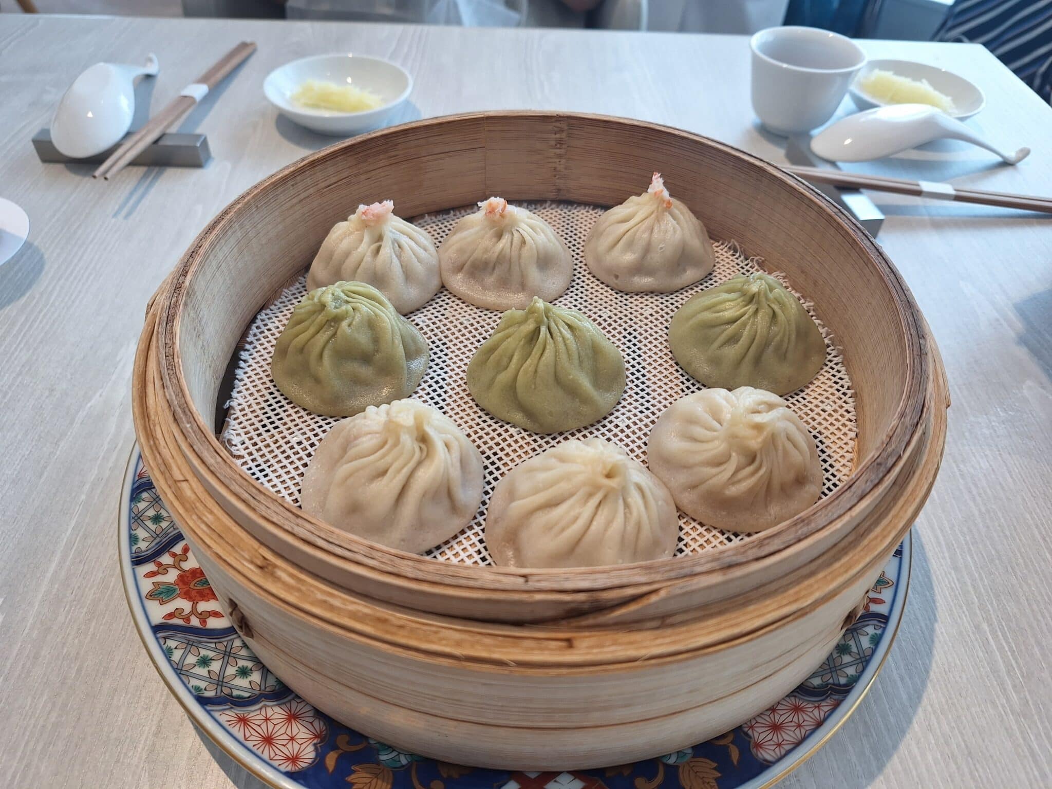 小籠包3種盛り 「京鼎小籠包」(ジンディンショウロンポウ)はこの店の看板メニュー・「烏龍茶小籠包」は烏龍茶葉が生地に練り込まれている・「蟹肉小籠包」はズワイ蟹の身と蟹味噌がふんだんに!針生姜と黒酢で食す。俺は「京鼎小籠包」が好み!