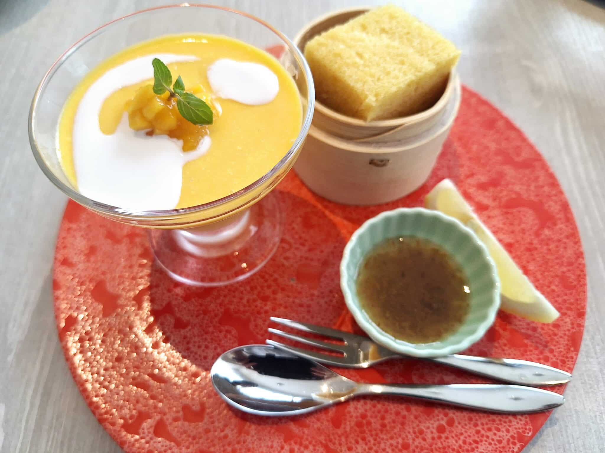 この蜂蜜の桂花醤にレモンを絞って、マーラーカオに付ける。美味い!そしてこのマンゴープリンが超旨い。ごちそうさまでした!