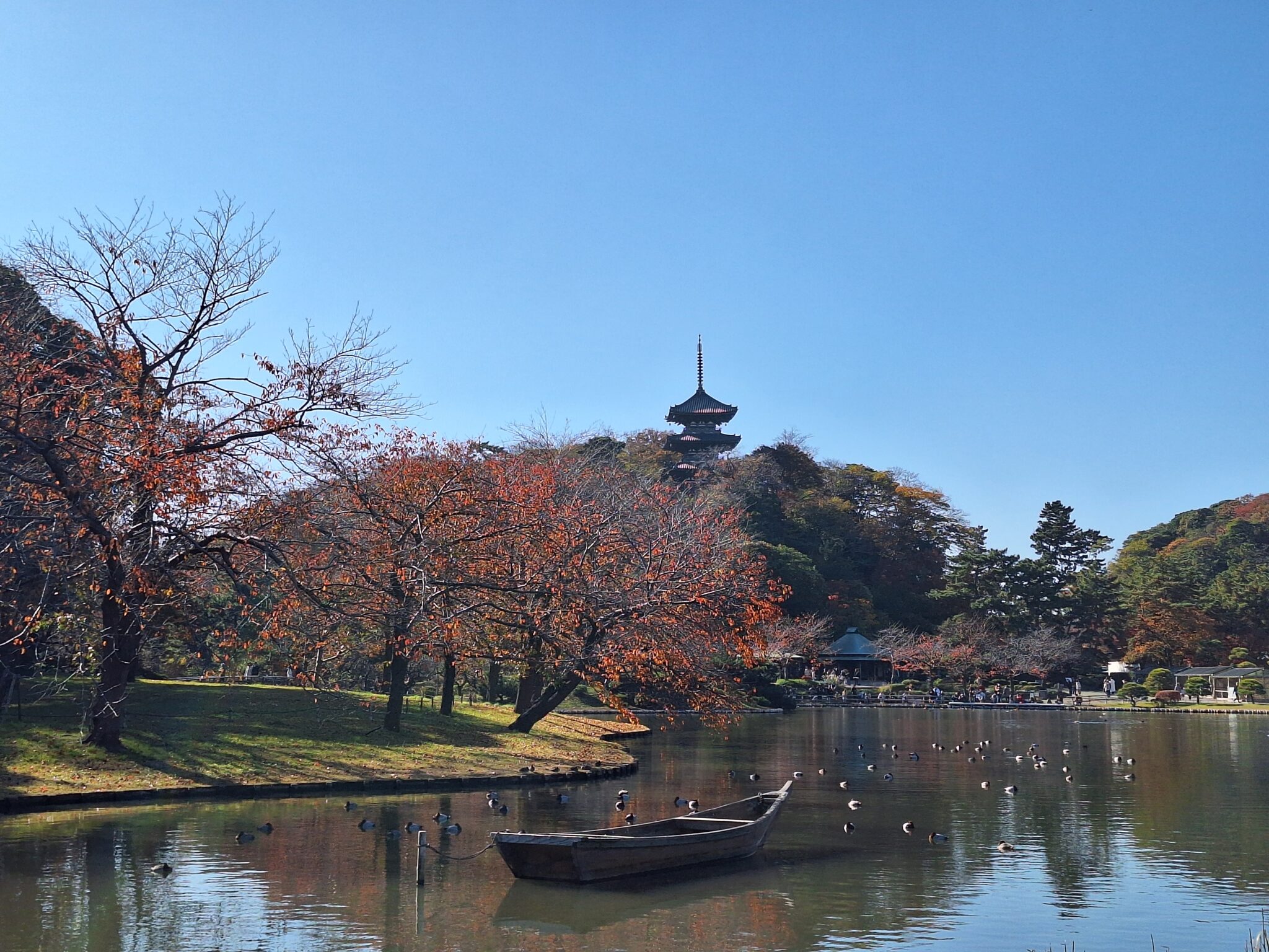 大池より旧燈明寺三重塔