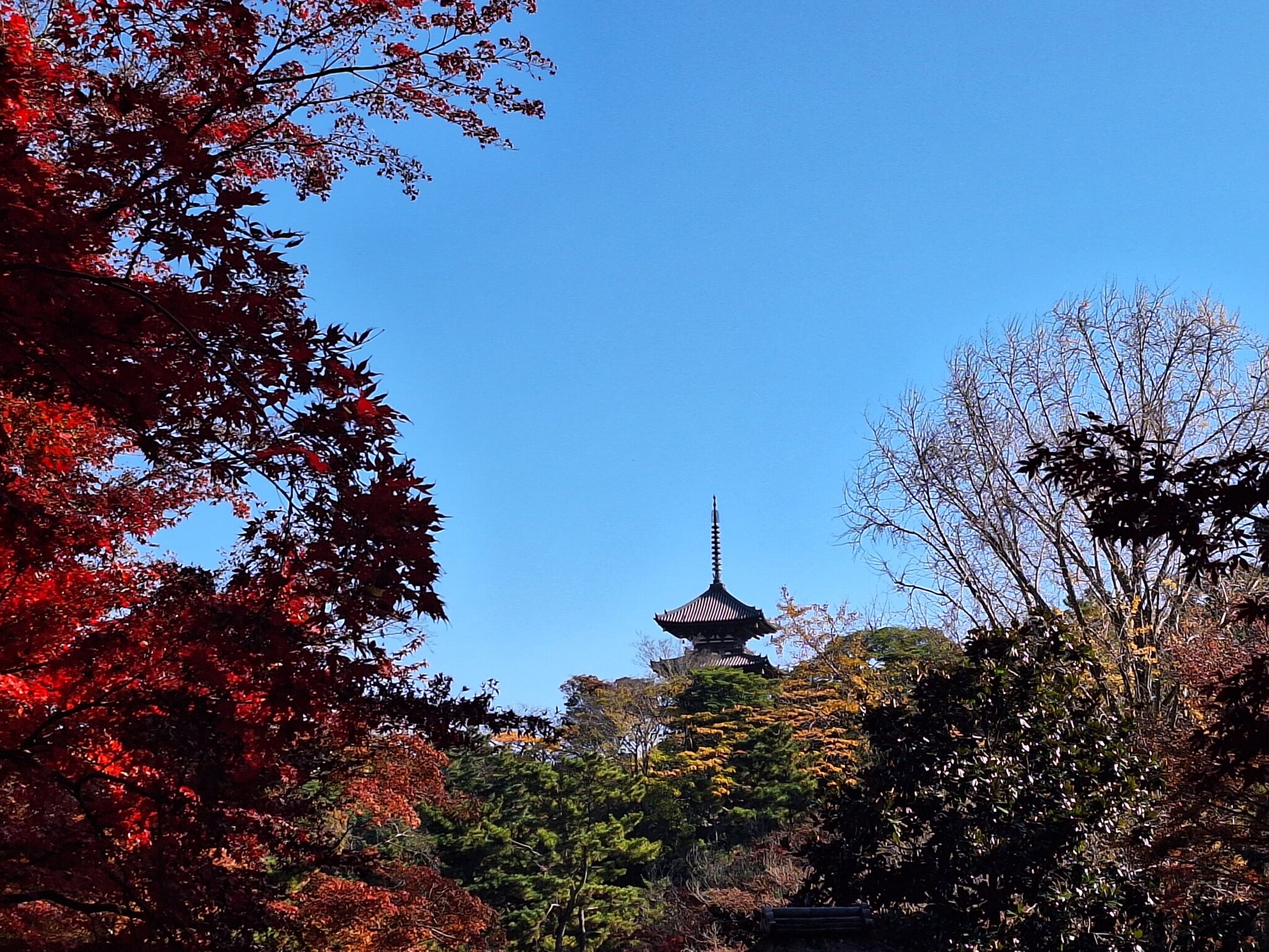 聴秋閣脇の遊歩道(季節公開)からの三重塔。