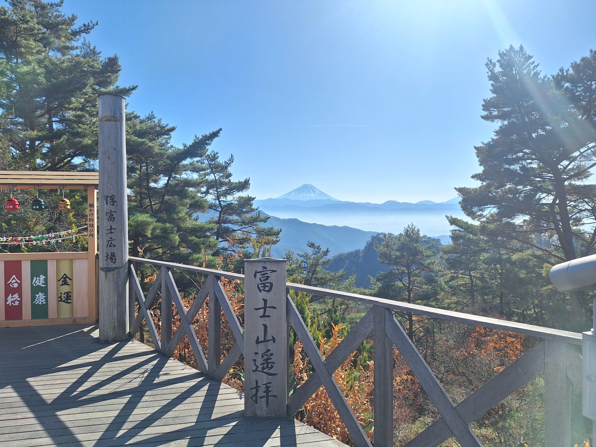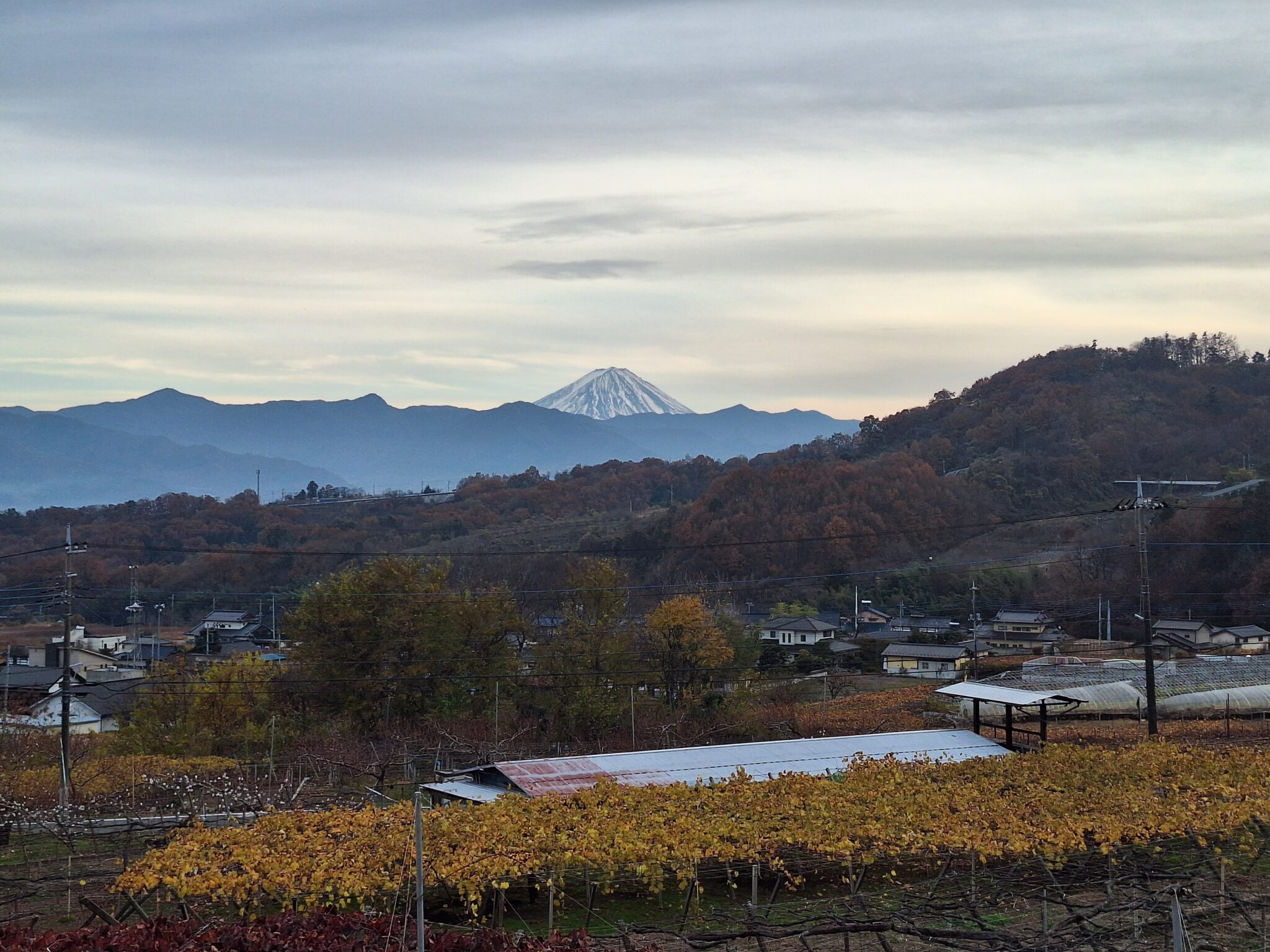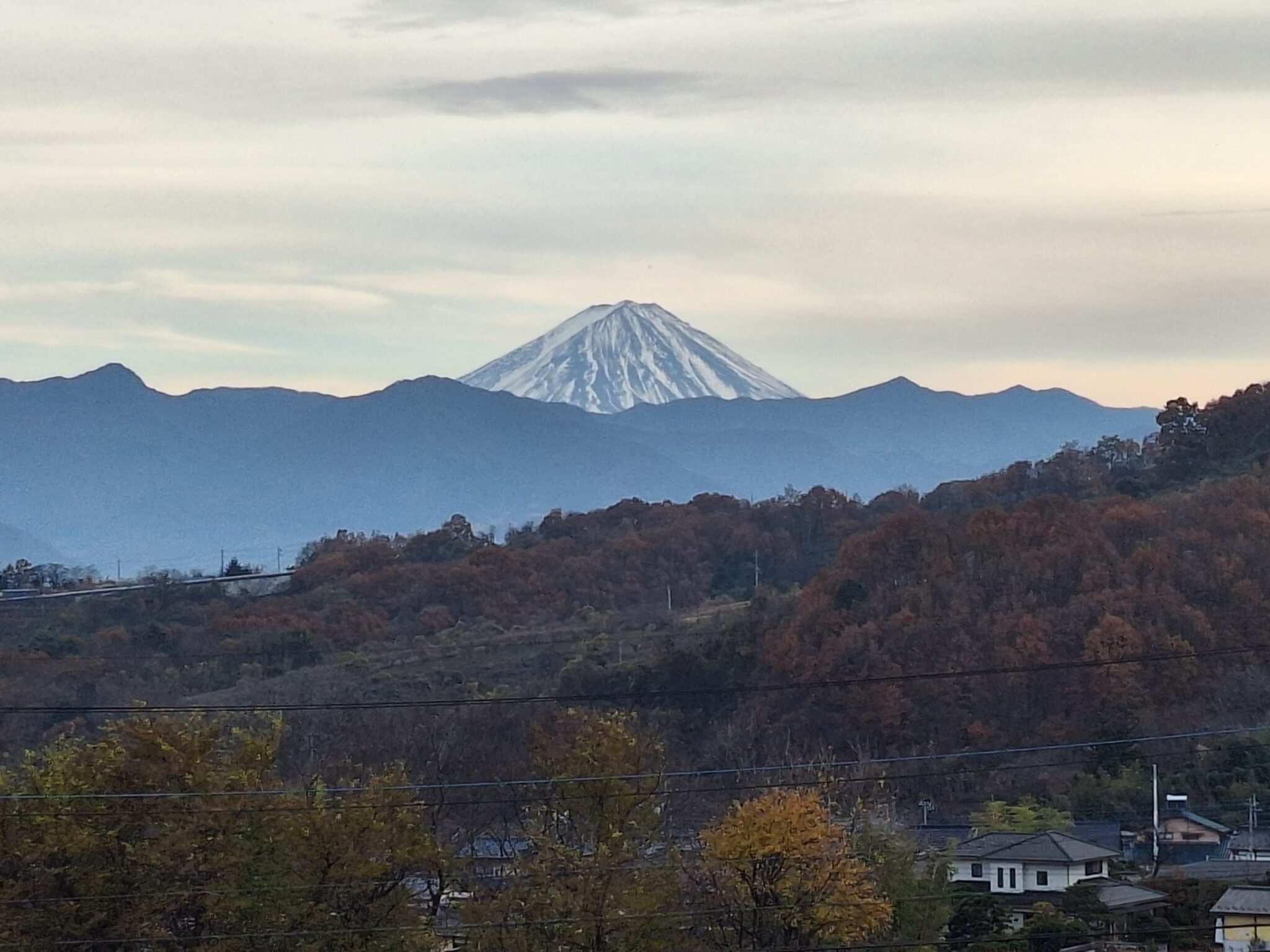グーグルで「頂上からの眺めがいい」との情報で、武田神社から太良峠へ向かう。途中、道幅狭く(車同士スライドできないほど)路面はガタガタ、小石ジャリジャリ、枯れ枝・枯れ葉いっぱい、「シカ・イノシシに注意」の看板。そしてまだ新しそうな「クマ注意」の看板、我が家の軽自動車では、かなり心許ない感じ。結局頂上付近まで到達するも、展望台や見晴台が見つからず、悪道を登って降りただけだった。(下り路は問題ありませんでした)それでも最後に富士山が見えたから、まあいいか!