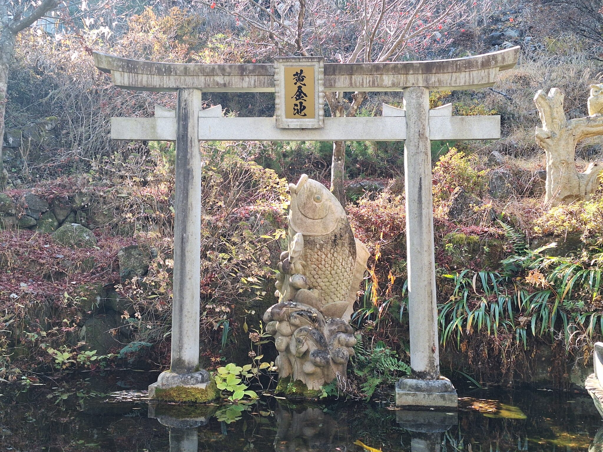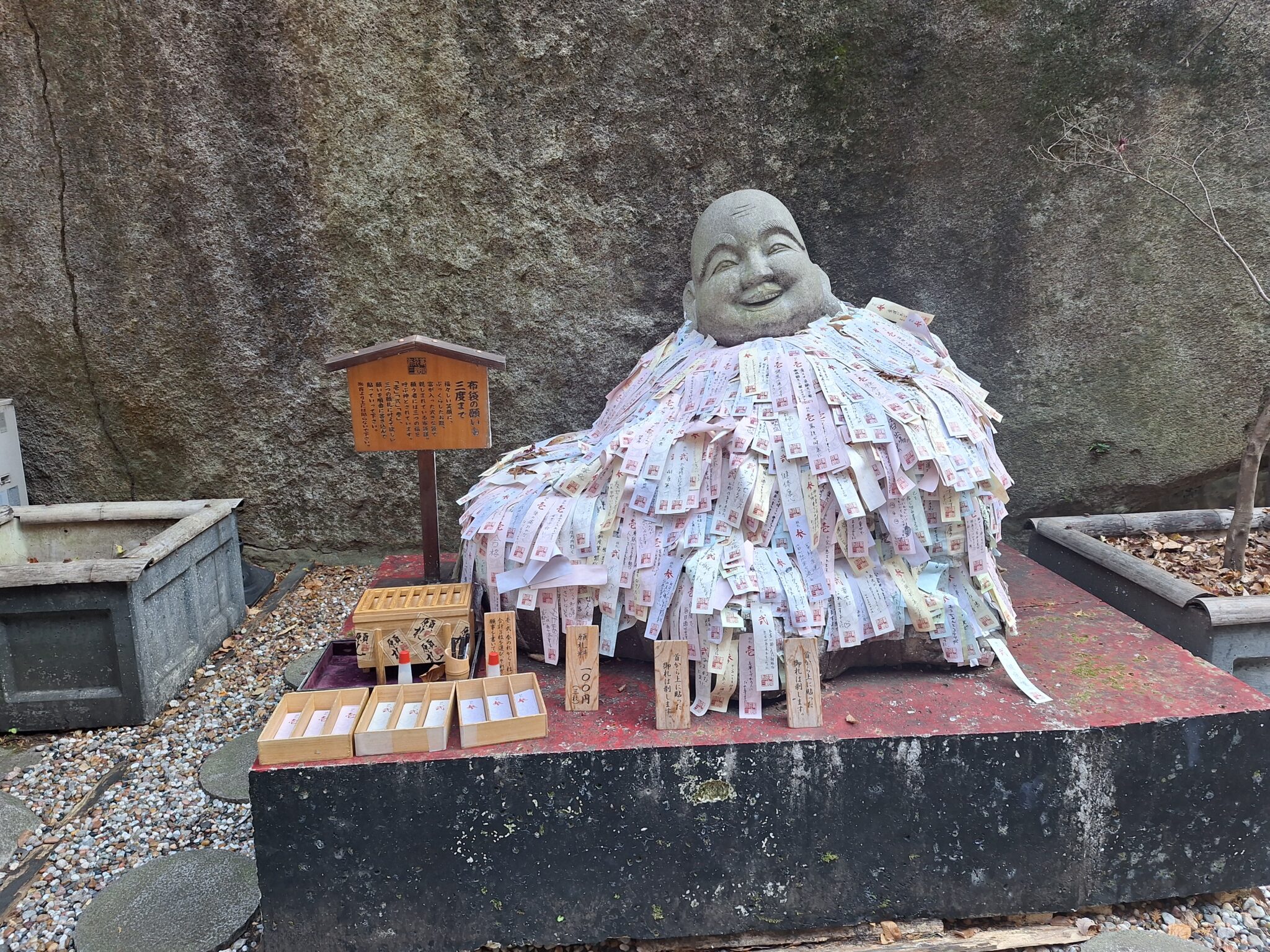 岩の隙間に1円玉を至る所に詰め込んでいる。ご利益があるのかな?バケツで拾い集めたら、すぐに300円くらいになりそう。ペットボトル買えるよ。(笑)