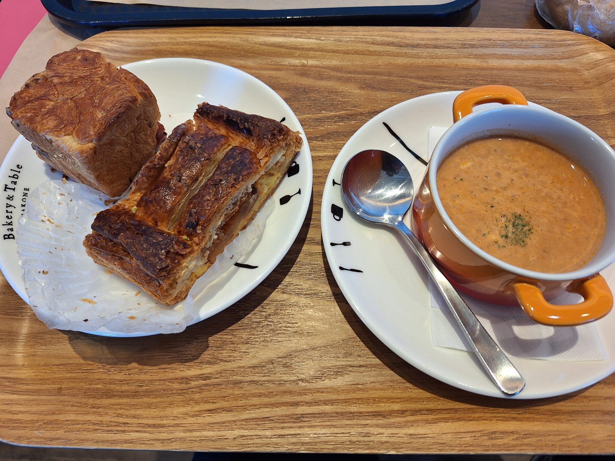 朝食は元箱根の「Bakery&Table箱根」へ。いつもここではテイクアウトか店頭の足湯に浸かって利用したことしかなかったけど、今日は2Fカフェでイートイン。1人ワンオーダーが必要です。カニと野菜のビスクスープをオーダーした。(※3Fコーヒーバーは高級コーヒーを出します。スープがないので2Fカフェに入りました)