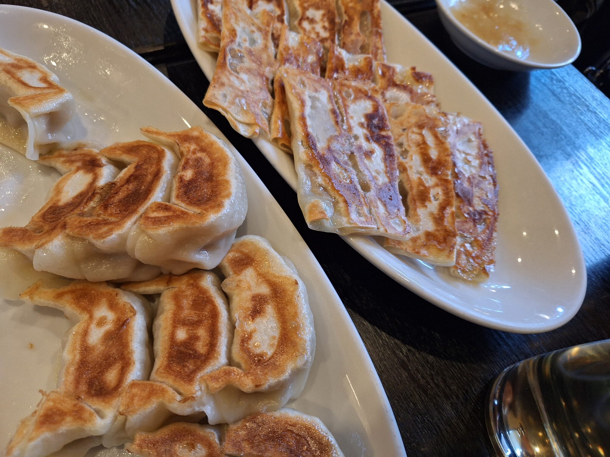 ランチは天鴻餃子房(テンコウギョウザボウ)にて。皆さん腹が減っていてガブガブ飲んでパクパク食べました。アルコールはビール大瓶5本、紹興酒ボトル1本、食べ物は名物黒豚餃子・ぱりぱり餃子・野菜餃子、たまごとキクラゲの炒め物、最後にやきそば。よく食べよく飲みました。(写真撮り忘れました)