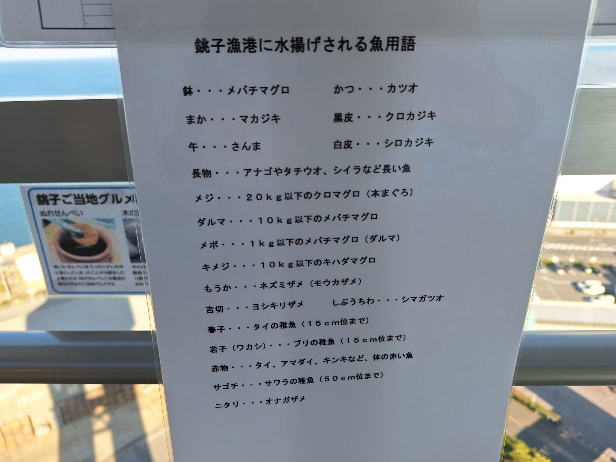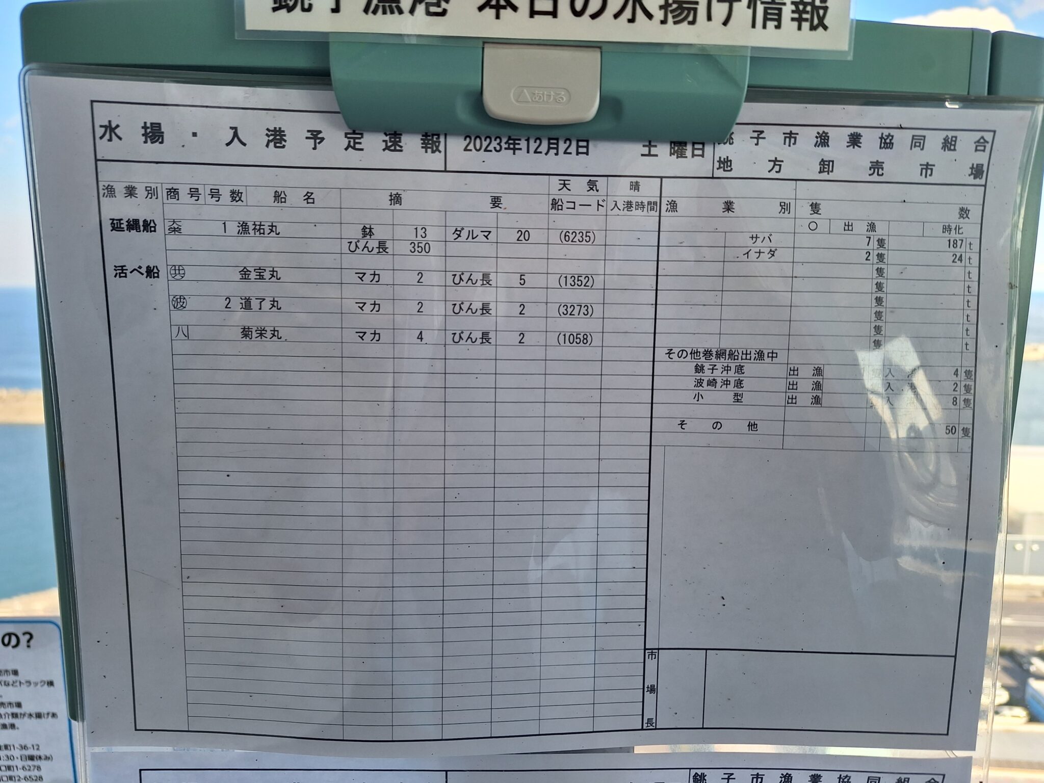 展望台に銚子港の本日の水揚げ情報が掲示されてました。みると楽しい!