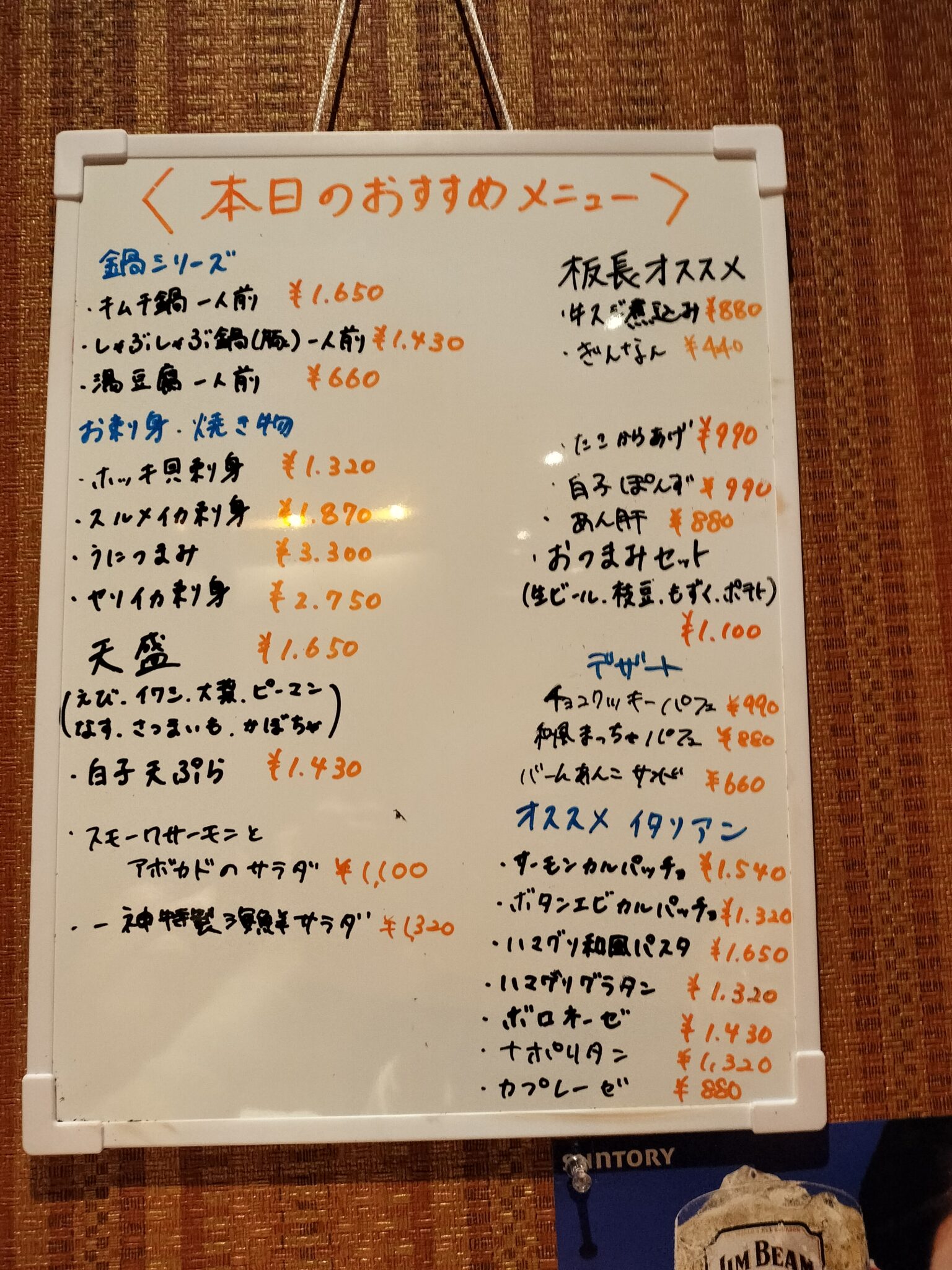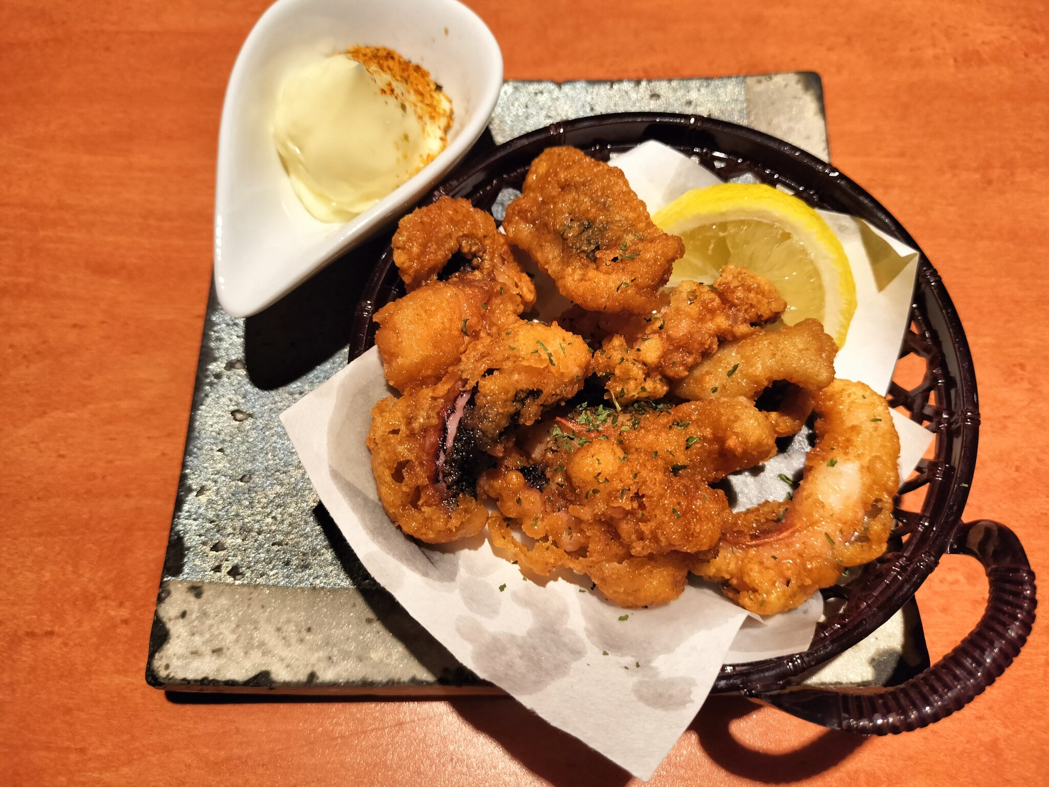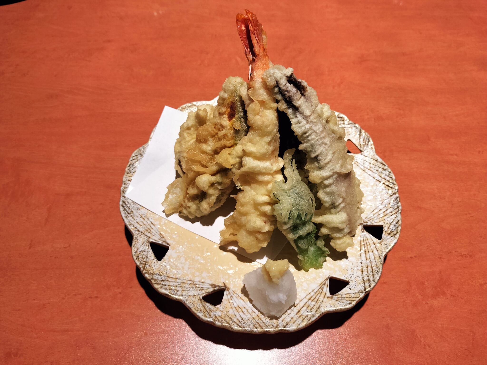 宿泊ホテルそばの居酒屋、鮓・地魚本舗一神へ。お通し、スモークサーモンとアボガドのサラダ、天ぷらの盛り合わせ、刺身の盛り合わせ2,530円(税別)、刺身・ビールの写真撮り忘れた。すべて旨かったけど料金が少しお高め。