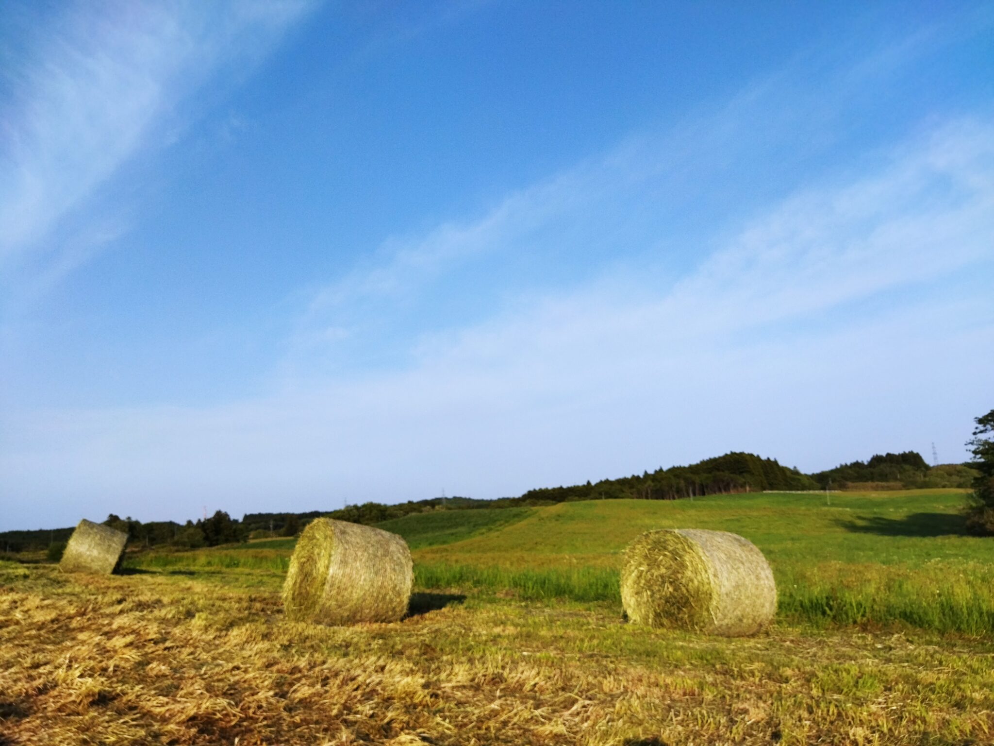 通りから離れた農道を行くと、畜産農家が牛に食べさせる牧草ロールが。こんなの見た事なかったので車から降りてそばまで見に。おかげで靴が埃だらけに。