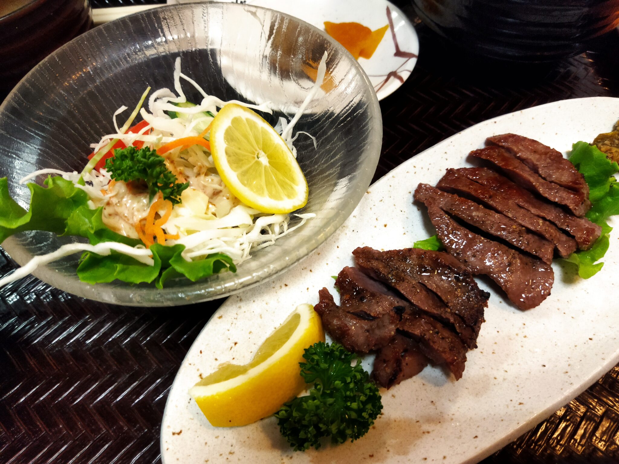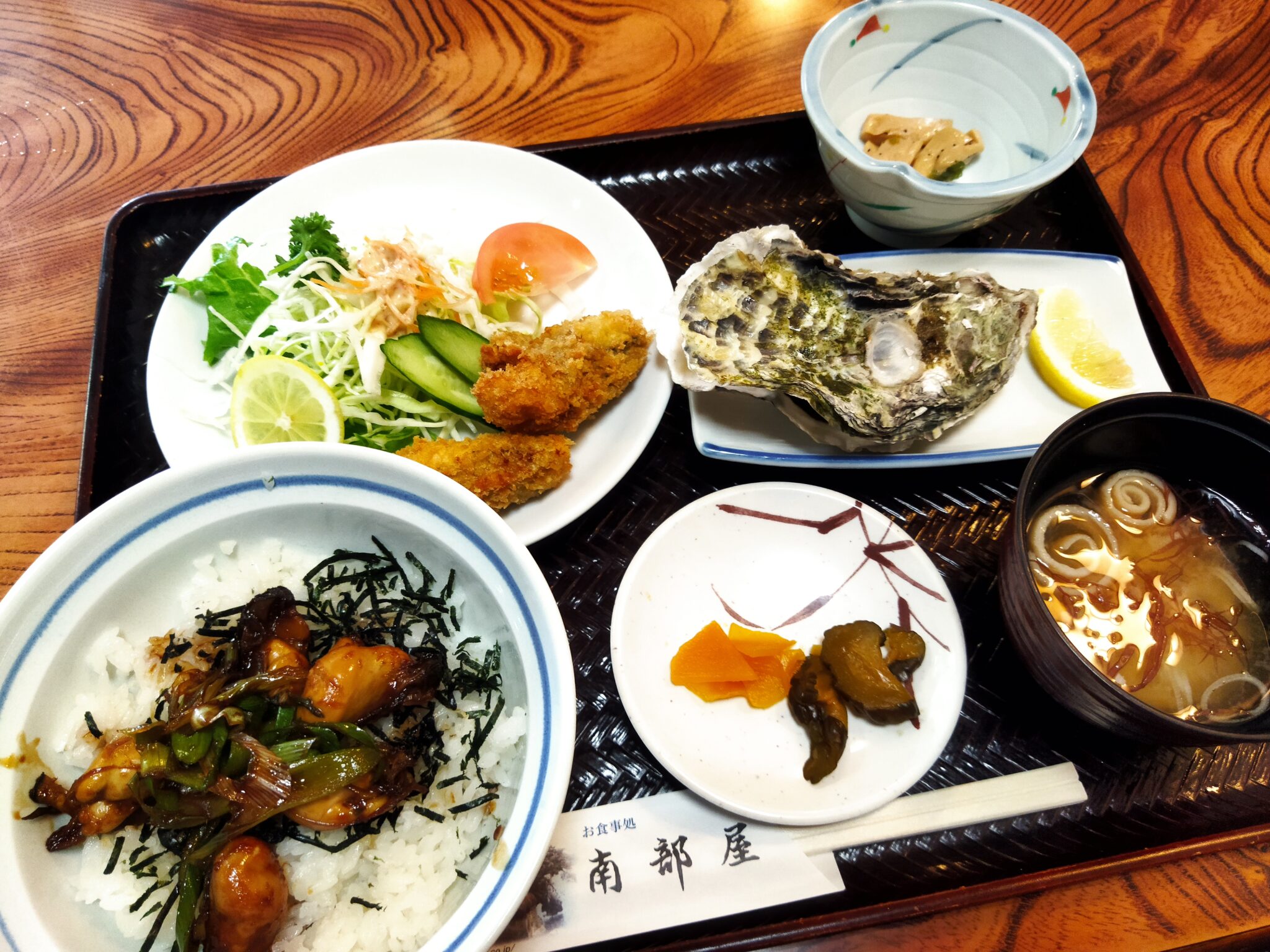 俺はかき丼セット。かき丼は、かきとねぎを甘辛煮にしてご飯の上に。焼き牡蠣とカキフライがついている。うまうま!妻は牛タン定食。牛タン一口いただきました。うまうまでした!