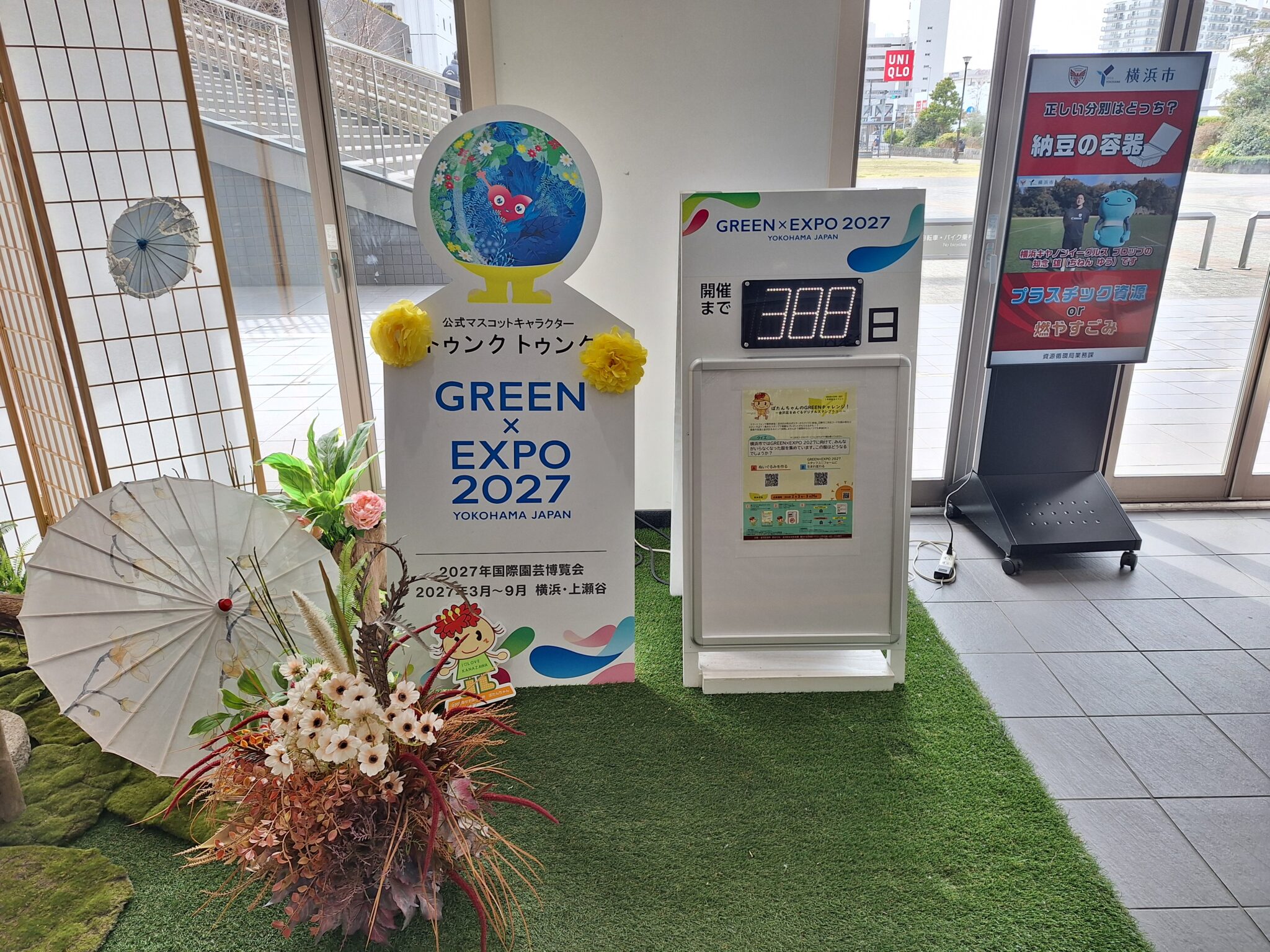 区役所エントランスに貼られたGREEN×EXPO 2027のポスター。