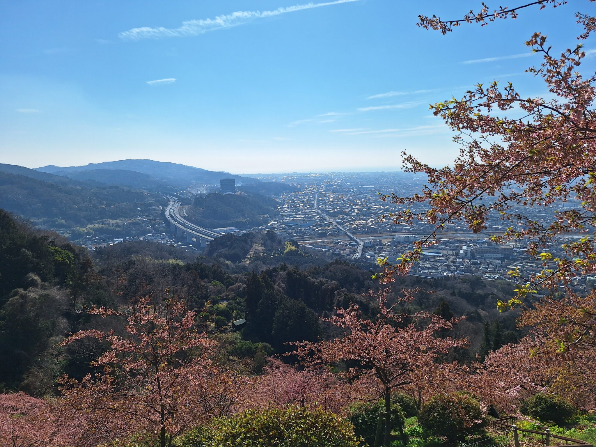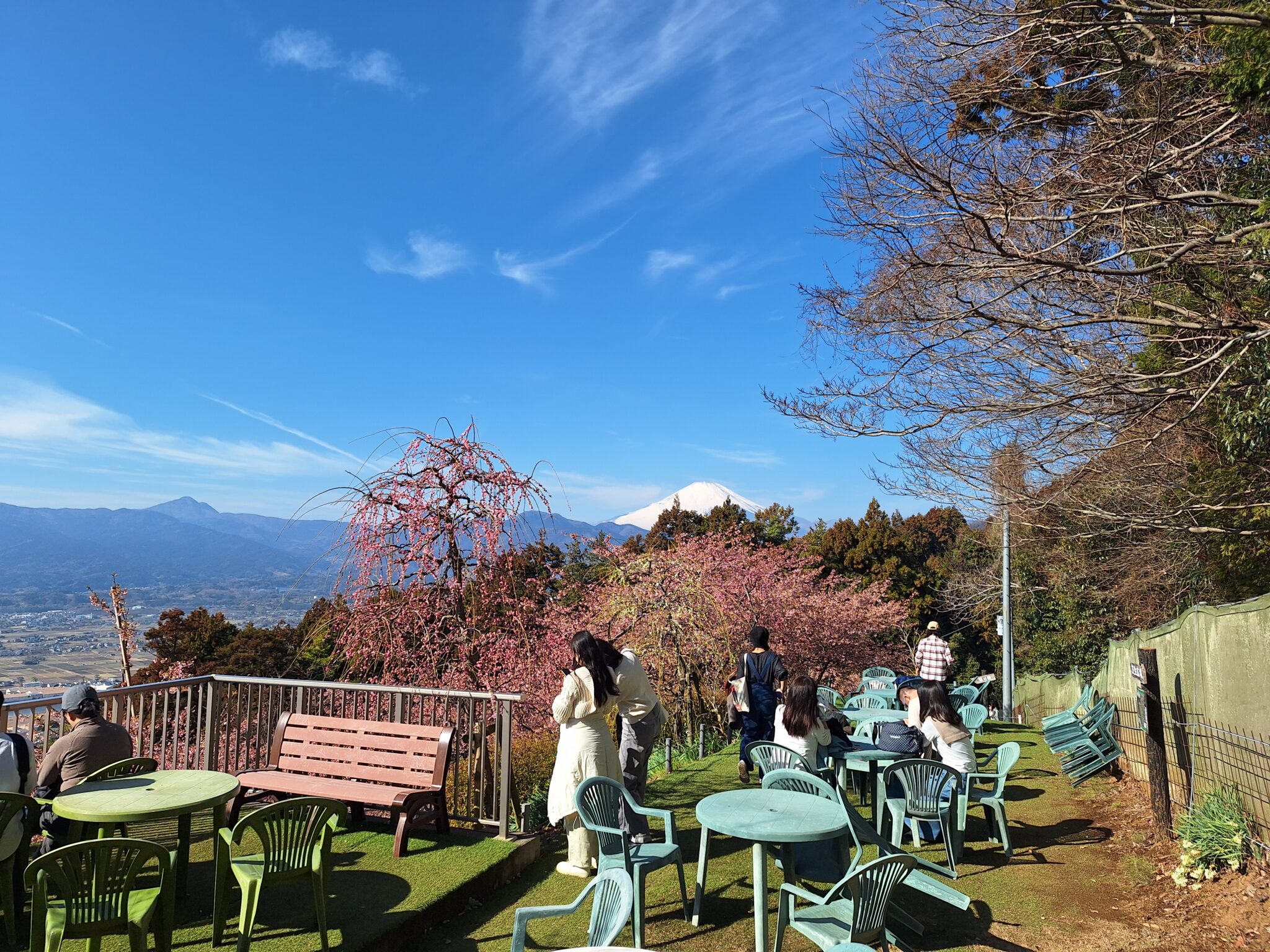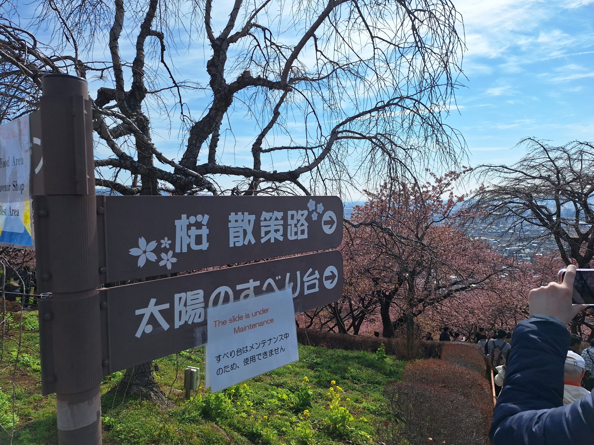 「まつだ桜まつり」西平畑公園会場より登り坂で約12分。あぐりパーク嵯峨山苑(別料金)へ。西平畑公園より高所で「富士見の丘 展望テラス」からの眺望・河津桜&菜の花が美しい!しかし、ここまで歩いて来るのが大変。苑内も斜面の登り降りと、60過ぎのおっさんと心臓血管不全のカミさんはもうヘロヘロ。
