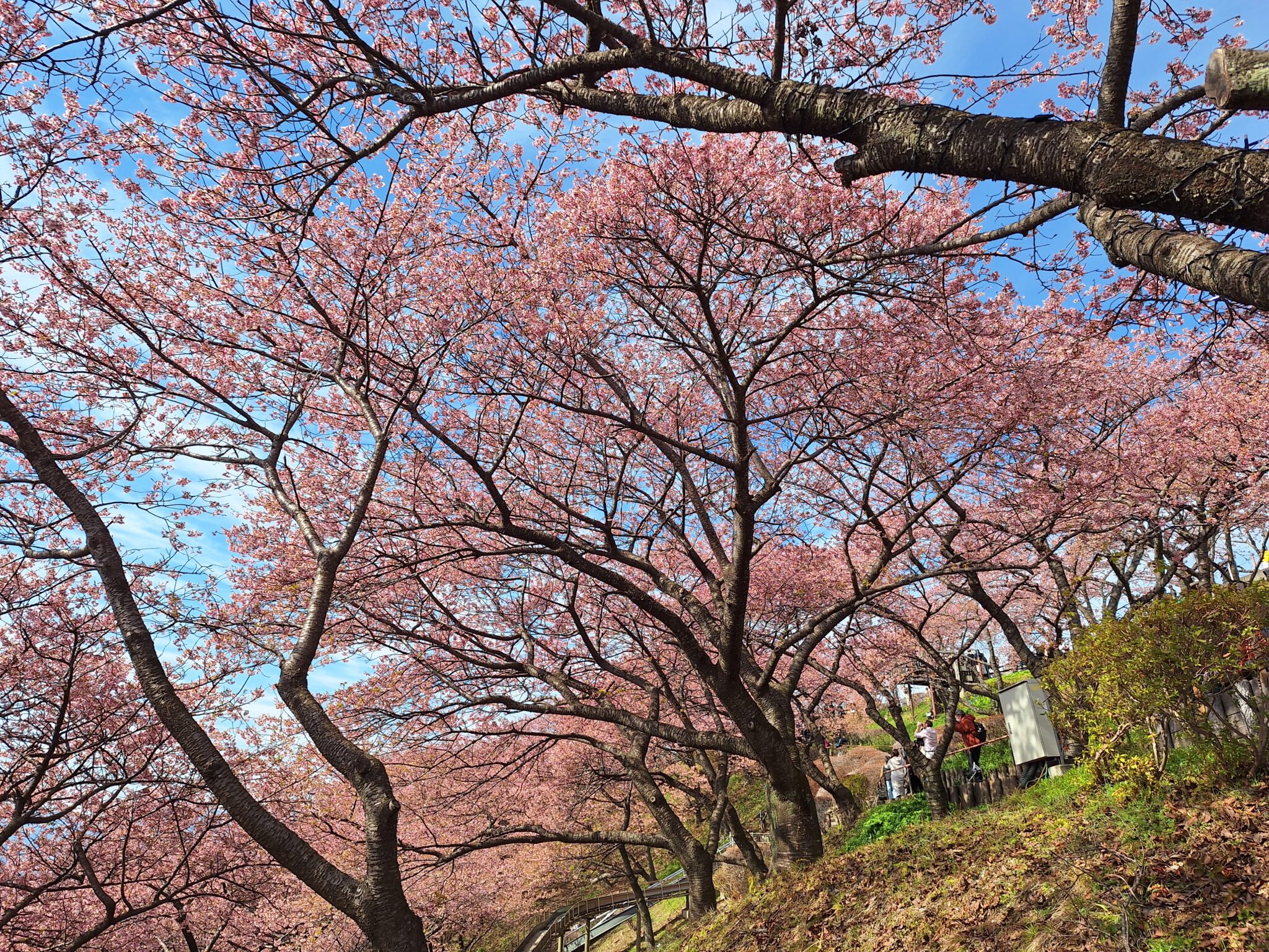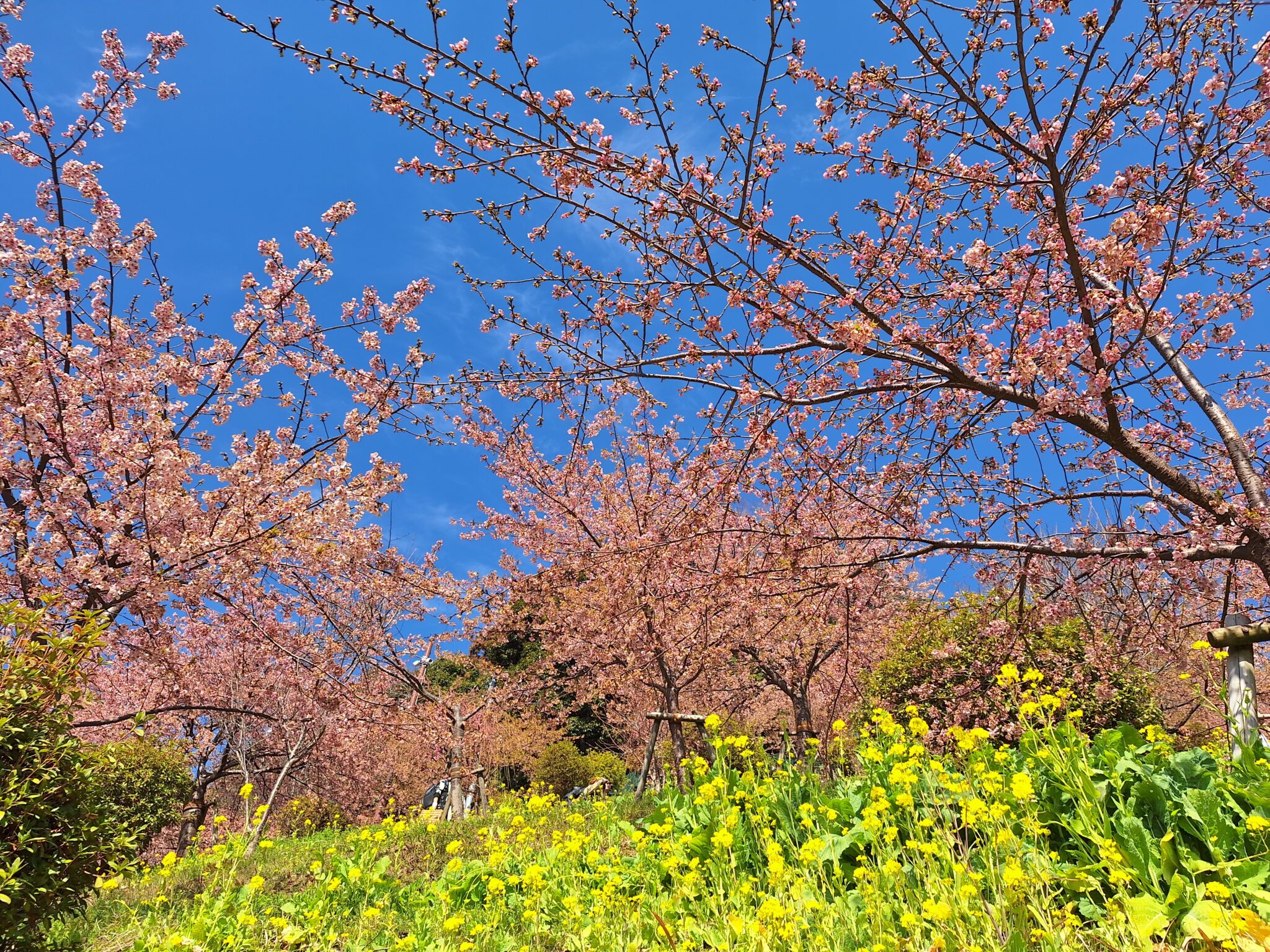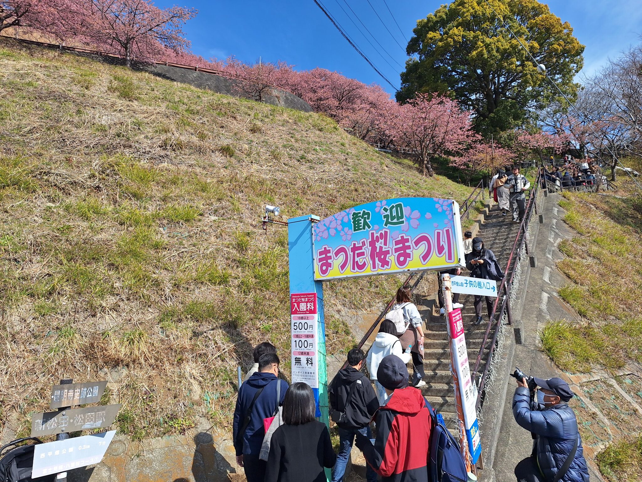 「まつだ桜まつり」西平畑公園会場より登り坂で約12分。あぐりパーク嵯峨山苑(別料金)へ。西平畑公園より高所で「富士見の丘 展望テラス」からの眺望・河津桜&菜の花が美しい!しかし、ここまで歩いて来るのが大変。苑内も斜面の登り降りと、60過ぎのおっさんと心臓血管不全のカミさんはもうヘロヘロ。