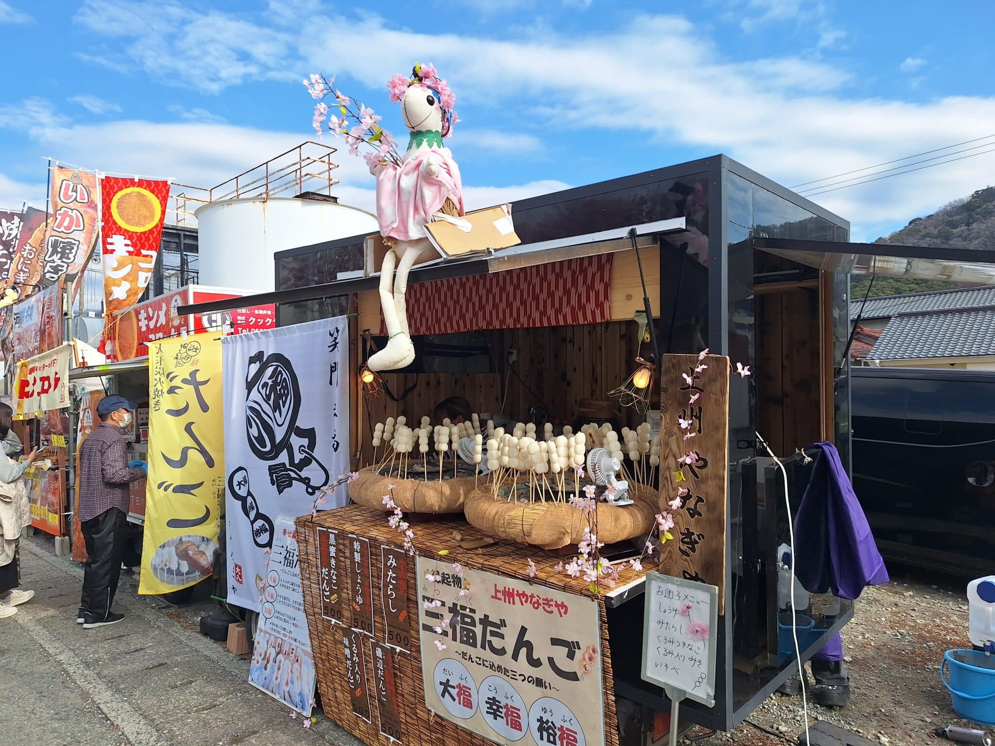 駅より河津川沿いの桜並木方面へ。たくさんの露店が並ぶ。