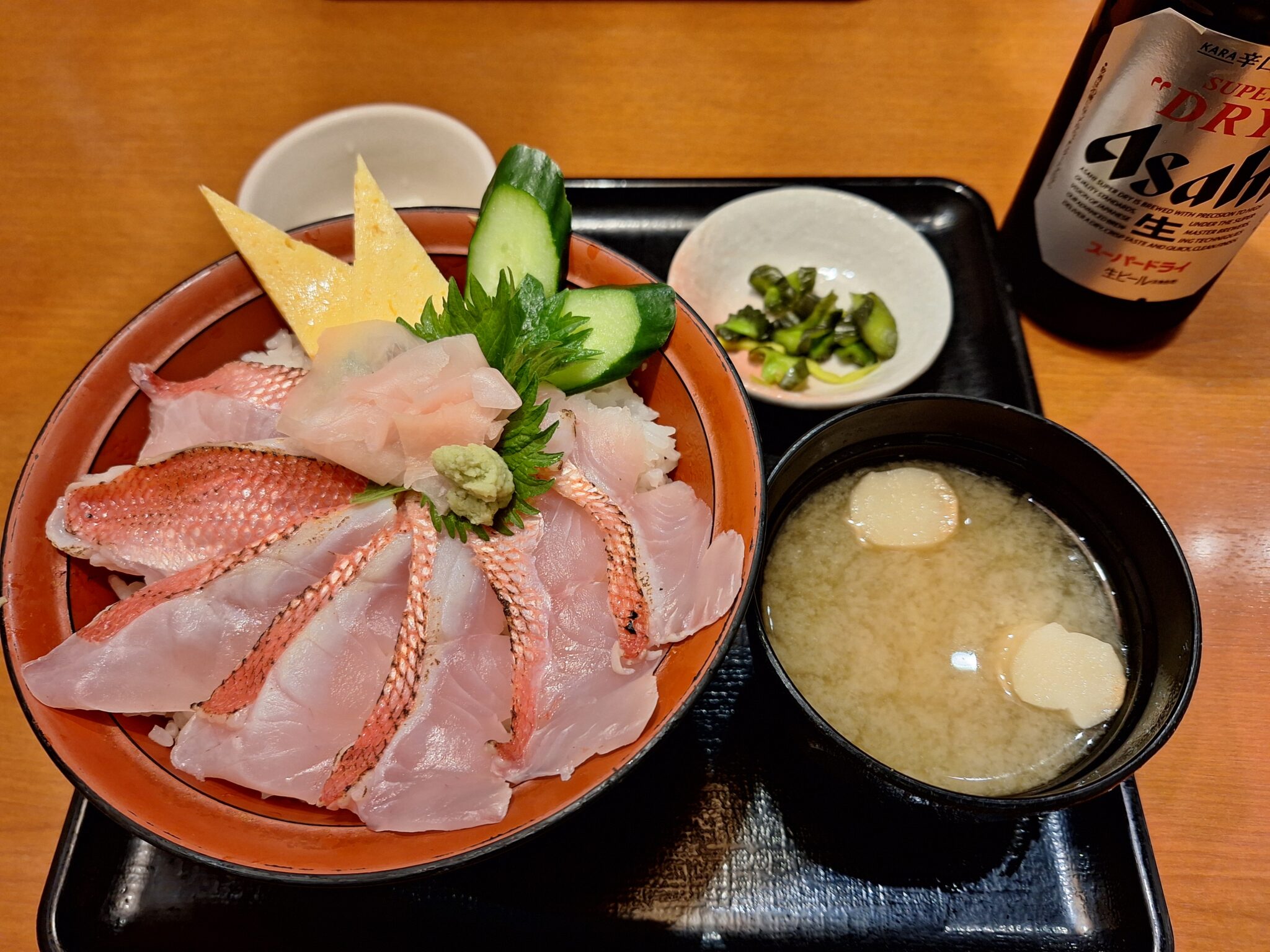「金目鯛のぼり」に惹かれて駅構内の「さかなや道場」へ。「金目鯛の煮付け定食」か「炙り金目鯛丼」にするかちょっと悩むが「炙り金目鯛丼」を注文して大正解!河津桜まつりで我慢していたビールも注文。旨かった!ごちそうさまでした。