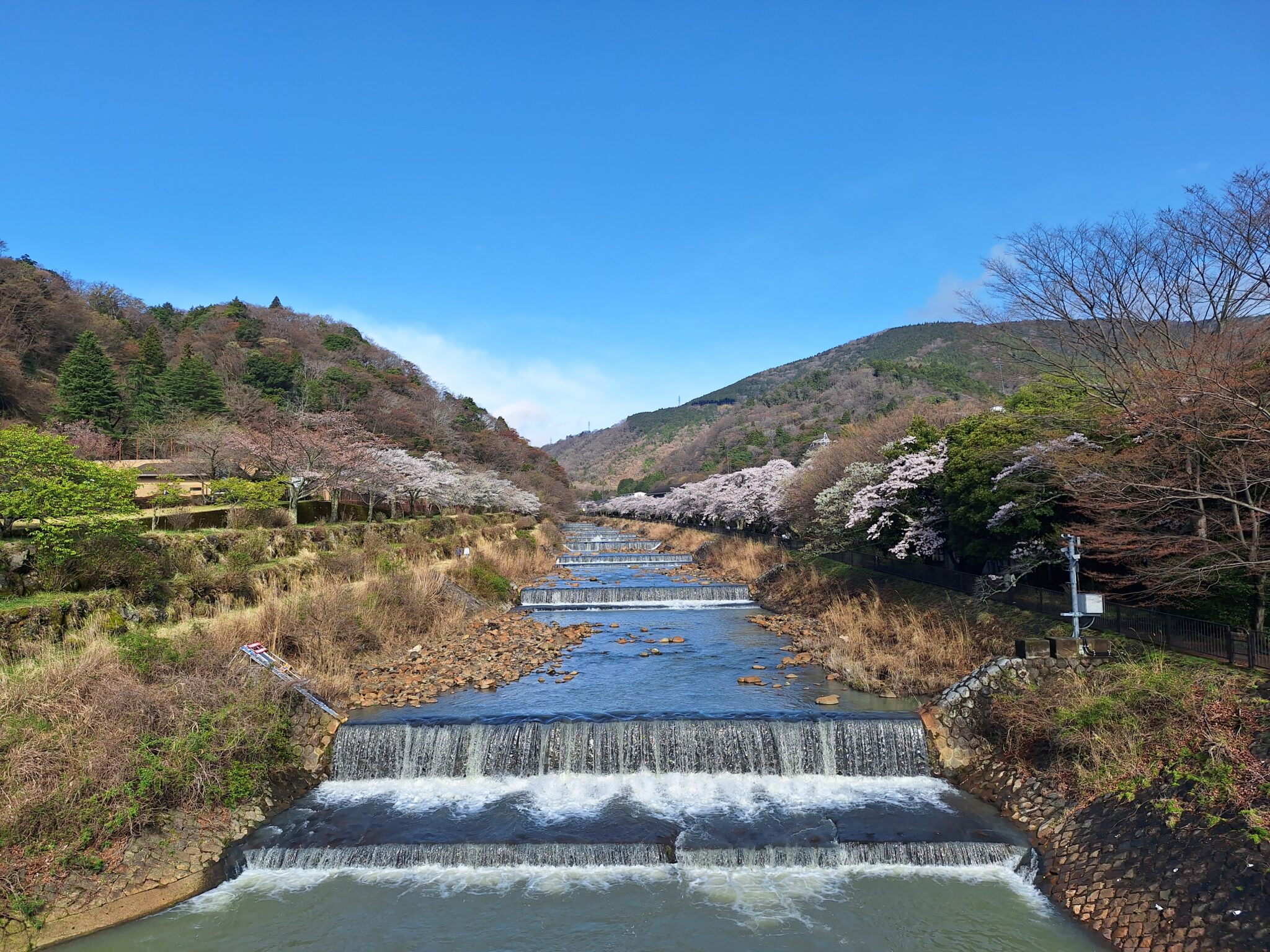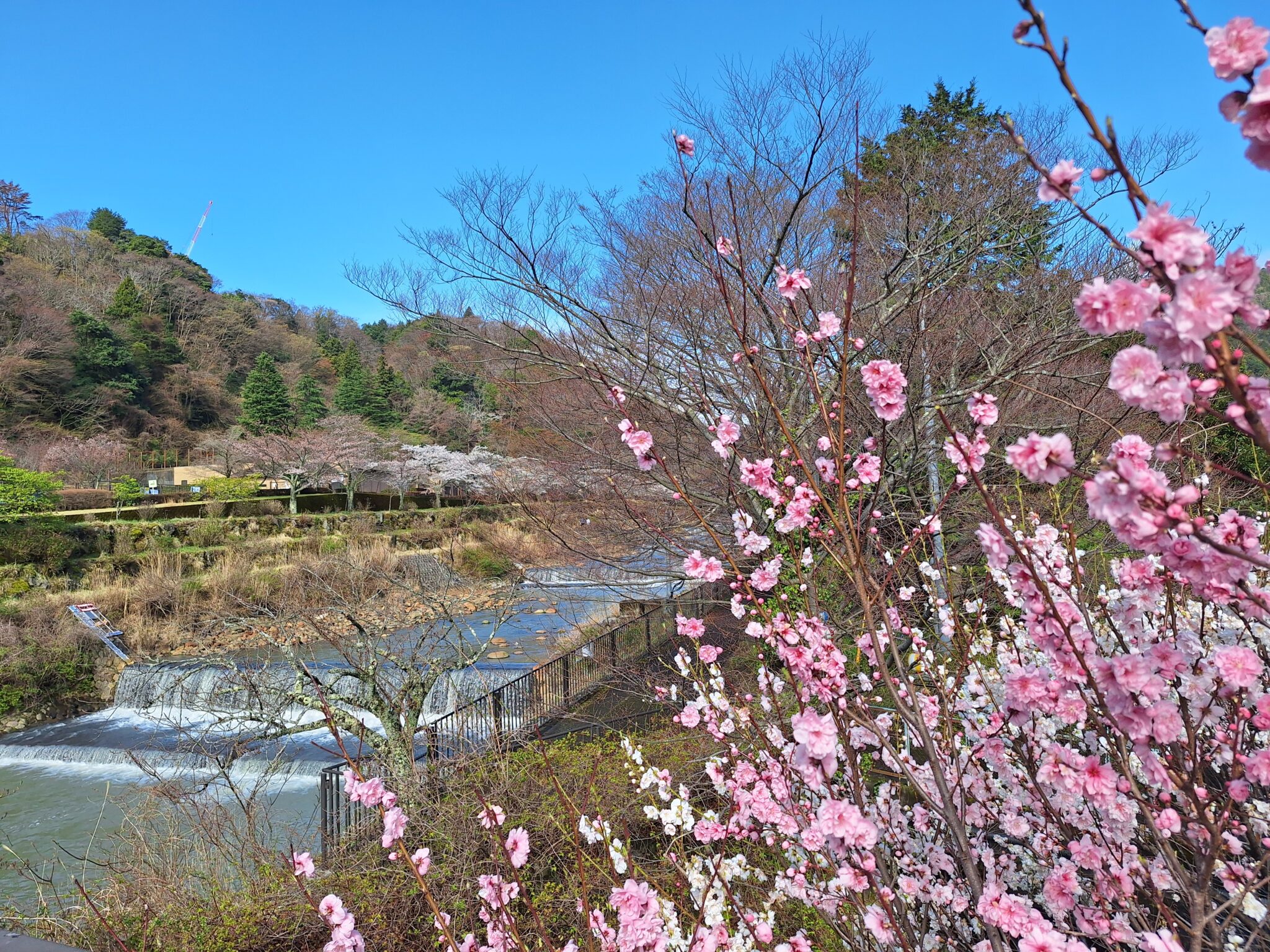 寄り道で、箱根宮城野の早川沿いの桜見物、ソメイヨシノは散り始め。青空で今日は富士山バッチリかな!と思っていたのだけど。