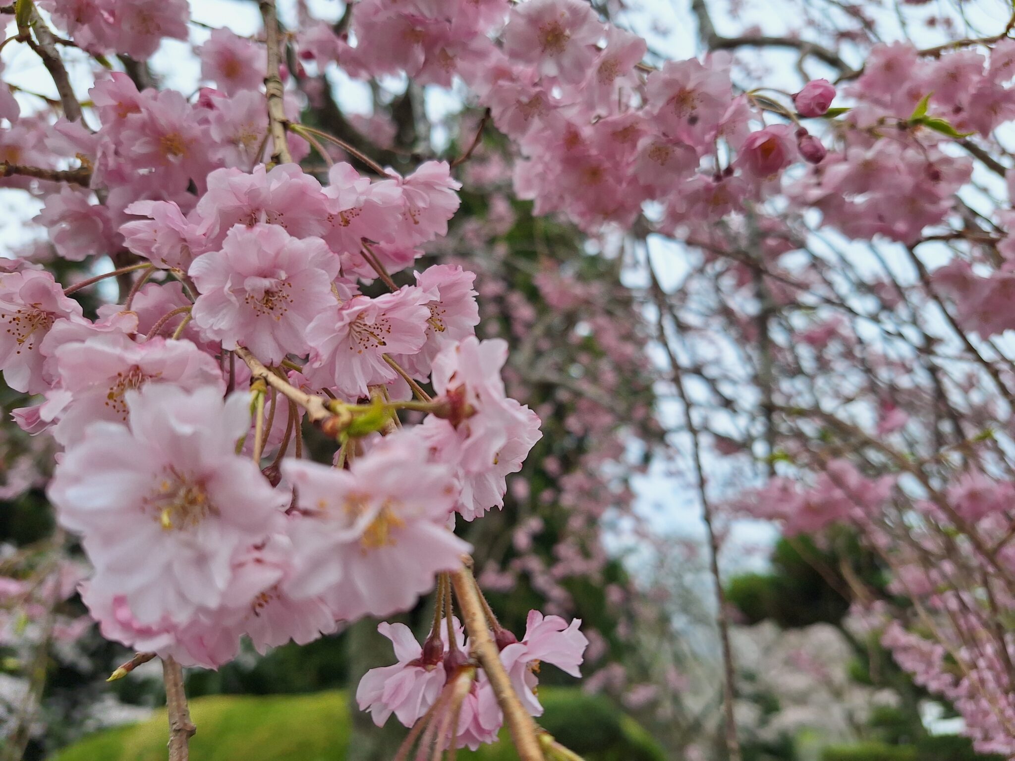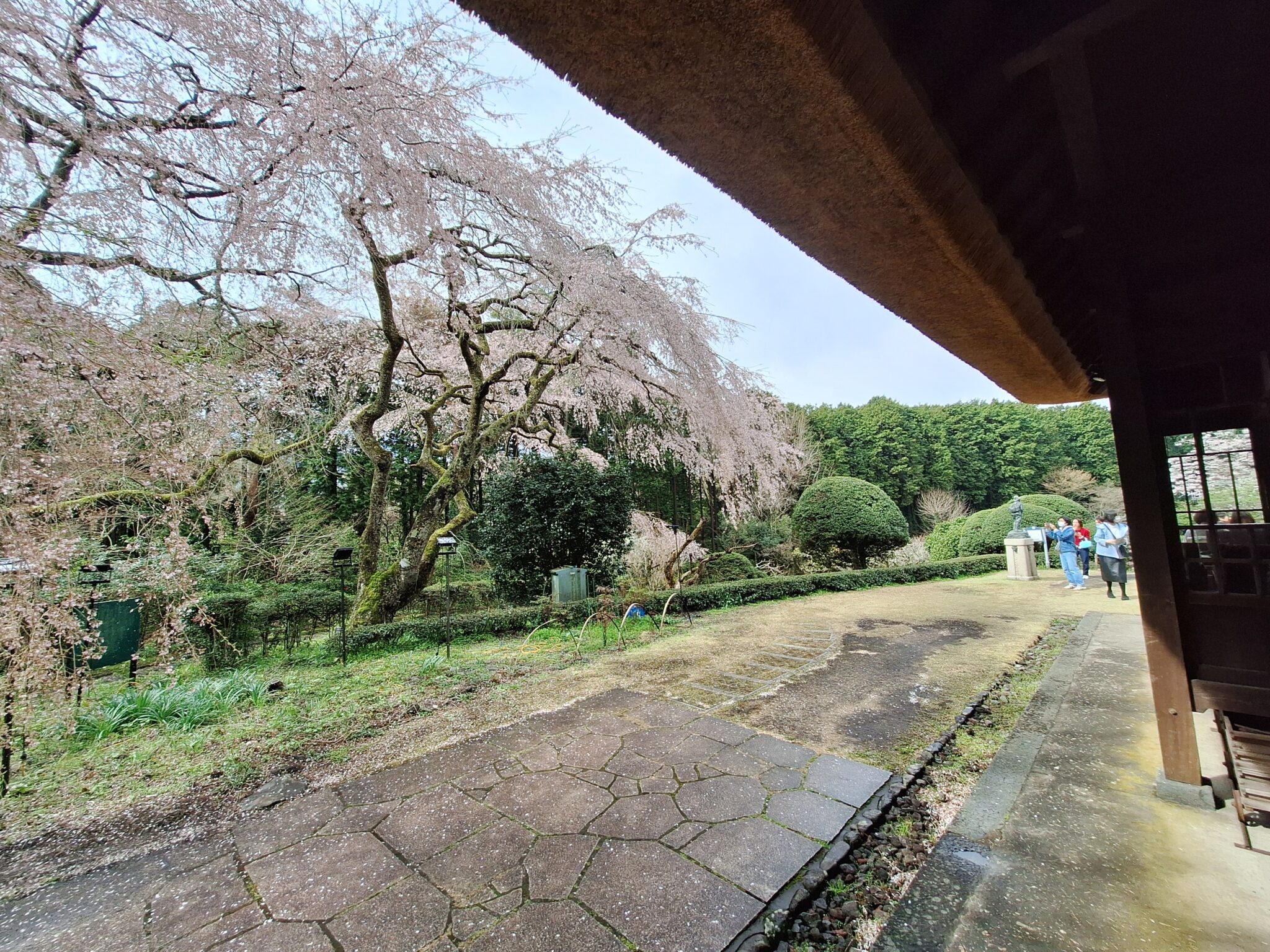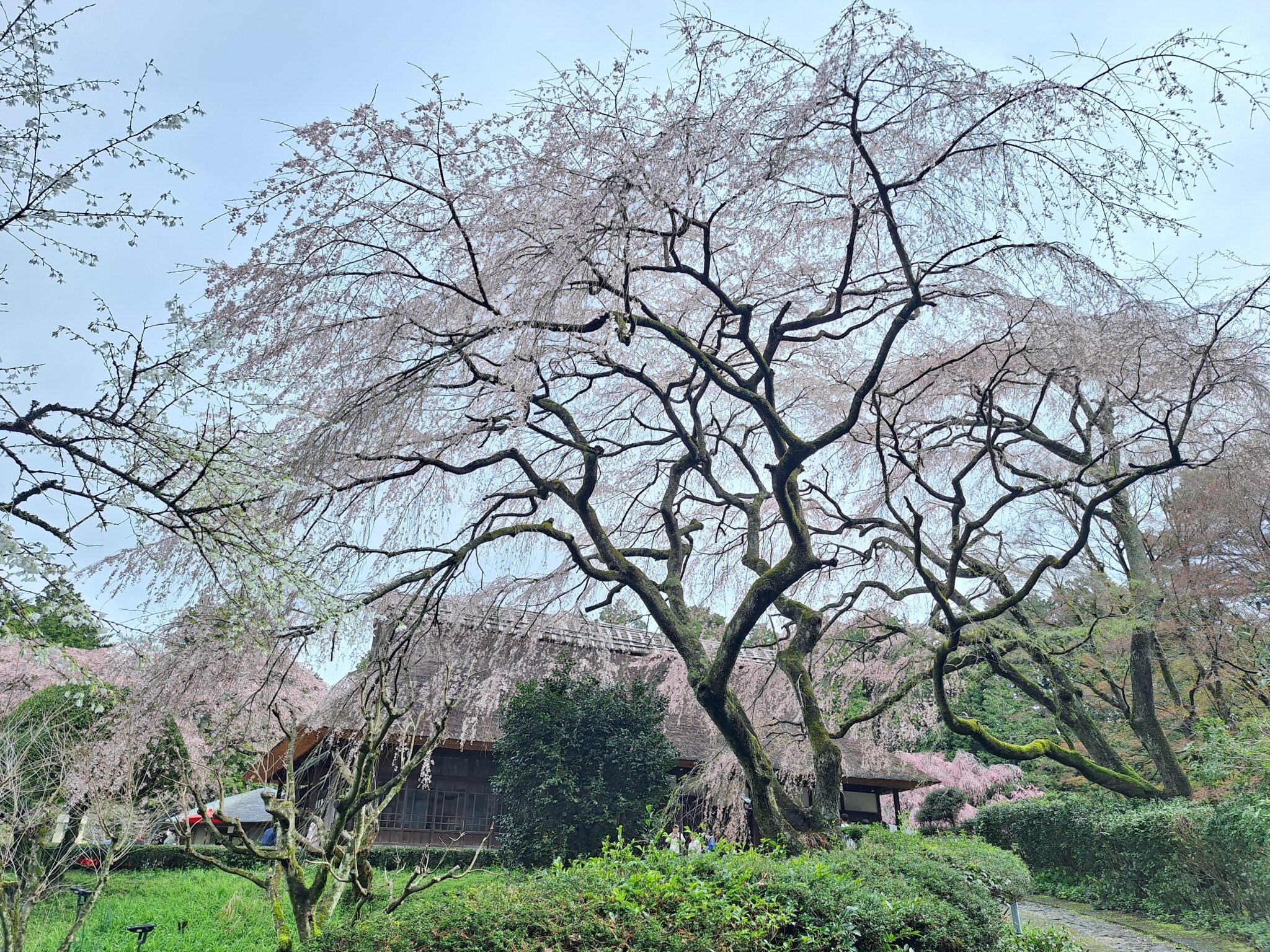 母屋周辺のしだれ桜は散り始め。それでも見応え充分でした。