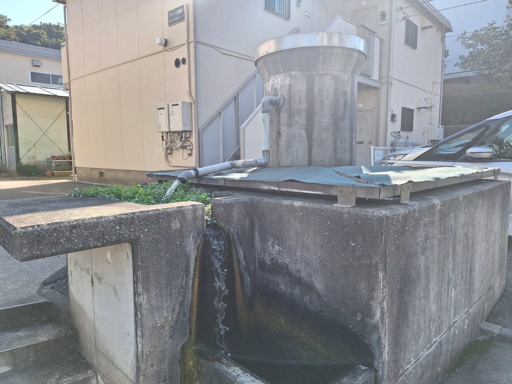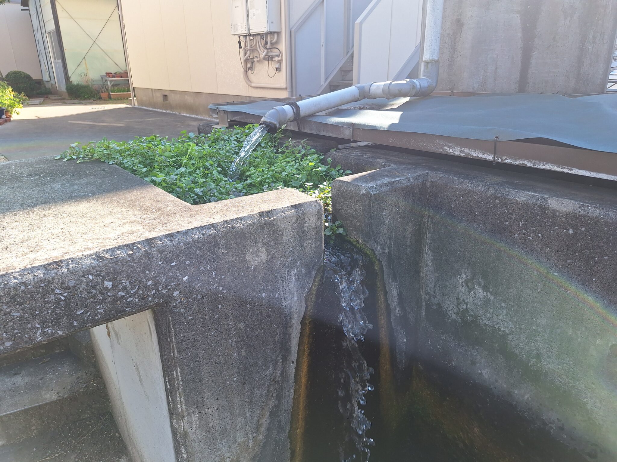 上の写真の御宅をさらに行くとドバドバと溢れる水。自噴井戸というそうです。井戸は通常はポンプなどで汲み上げるが、このように勝手に噴き出す井戸があります。