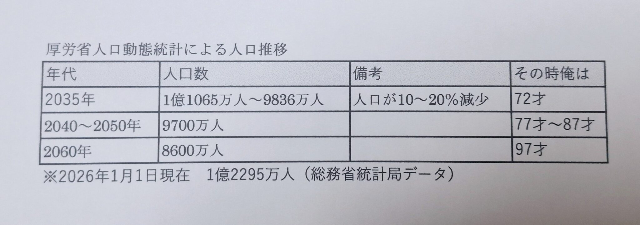 「20年後の日本の悲惨な現実が描かれています」と帯に書かれた本を一気読み。厚労省の人口動態統計の数値が示され自分の年齢を入れて表にしてみた。さすがに2060年97才まで生きてはいないだろうが驚く人口減少。内需依存の経済成立は2040年代で終了です。(1億人を割ると成立しないと言われます)