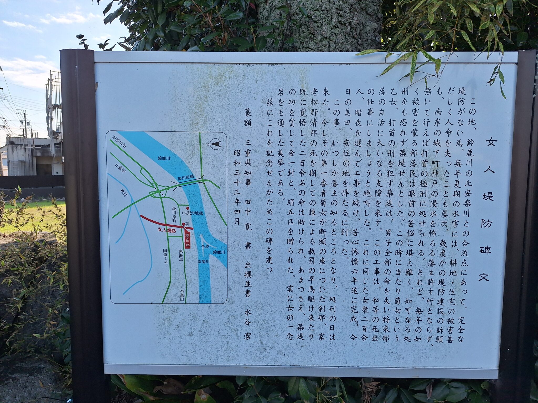 頻繁に水害に悩まされ築堤の許可を神戸藩に願い出るも許可されず、村の女衆は男より罪が軽く済むだろうと6年間で全て手作業で堤防を築き上げた。女性たちは処刑場に送られたが赦免の早馬で救われた。