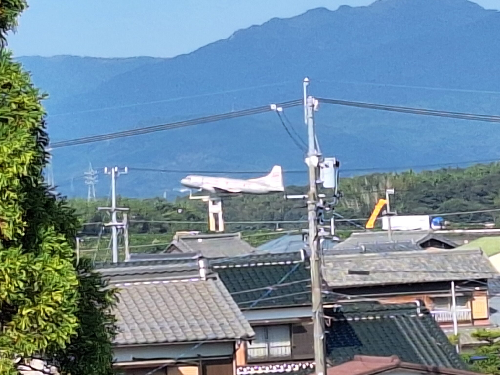 電車からも見えた飛行機、何だろう?太平洋戦争後に開発された実物機のようだがよくわからない。
