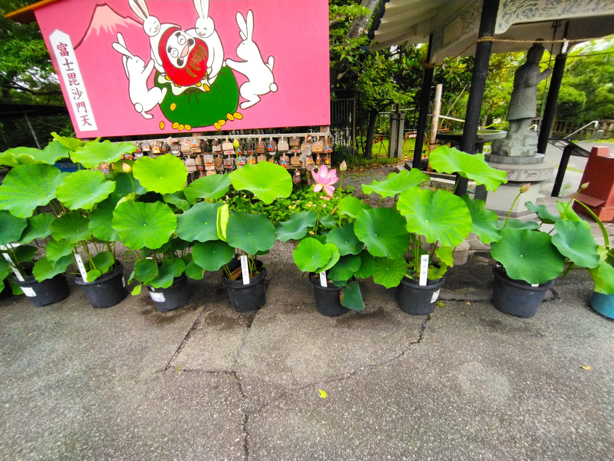 鉢に蓮が並べられて、一鉢だけ咲いてました。
