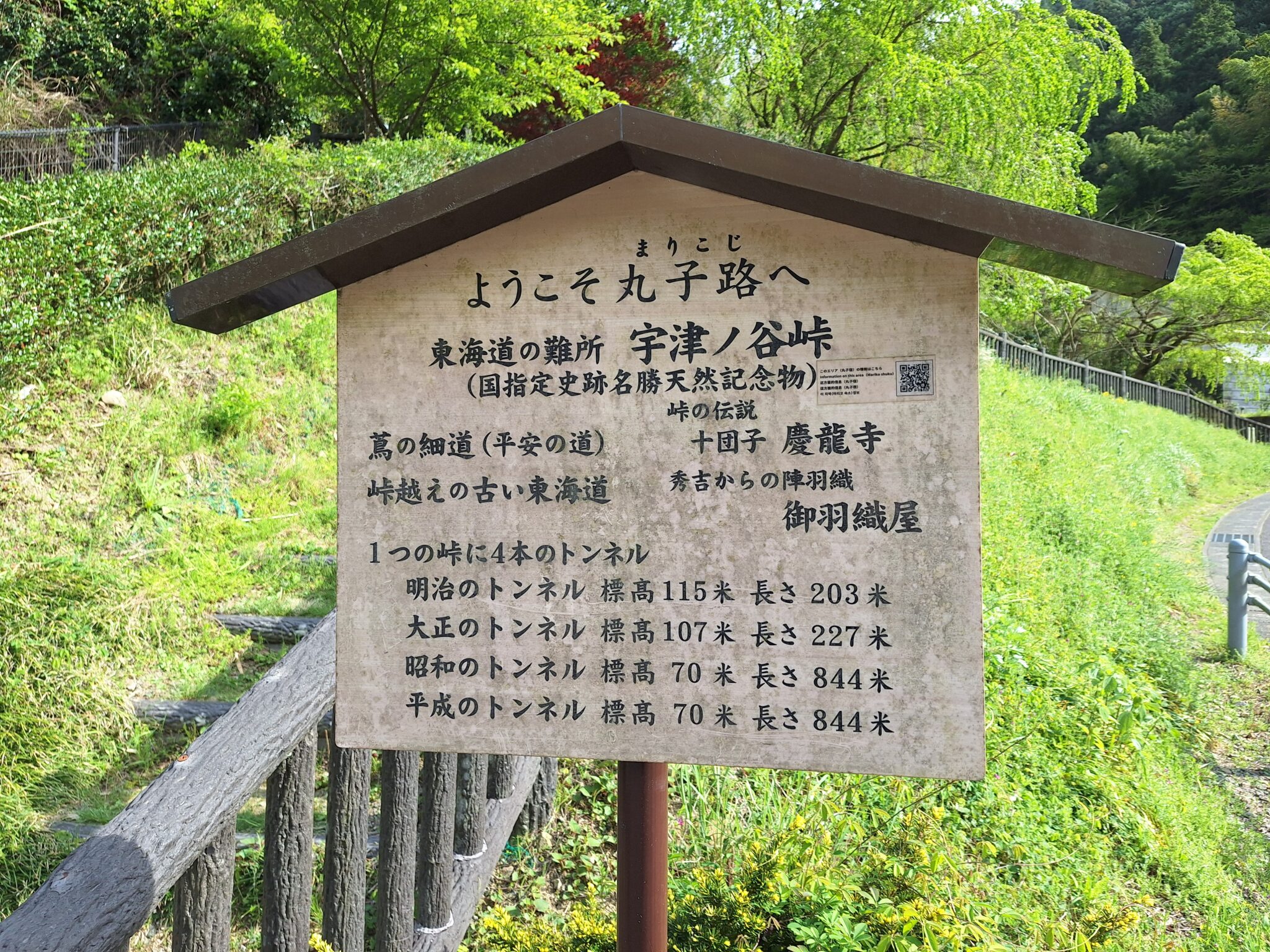 宇津ノ谷看板の左が旧東海道、宇津ノ谷集落へ向かう。